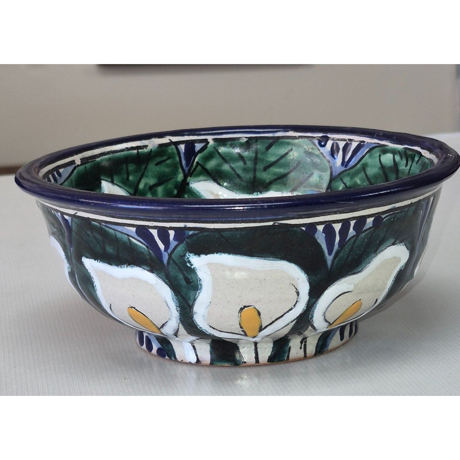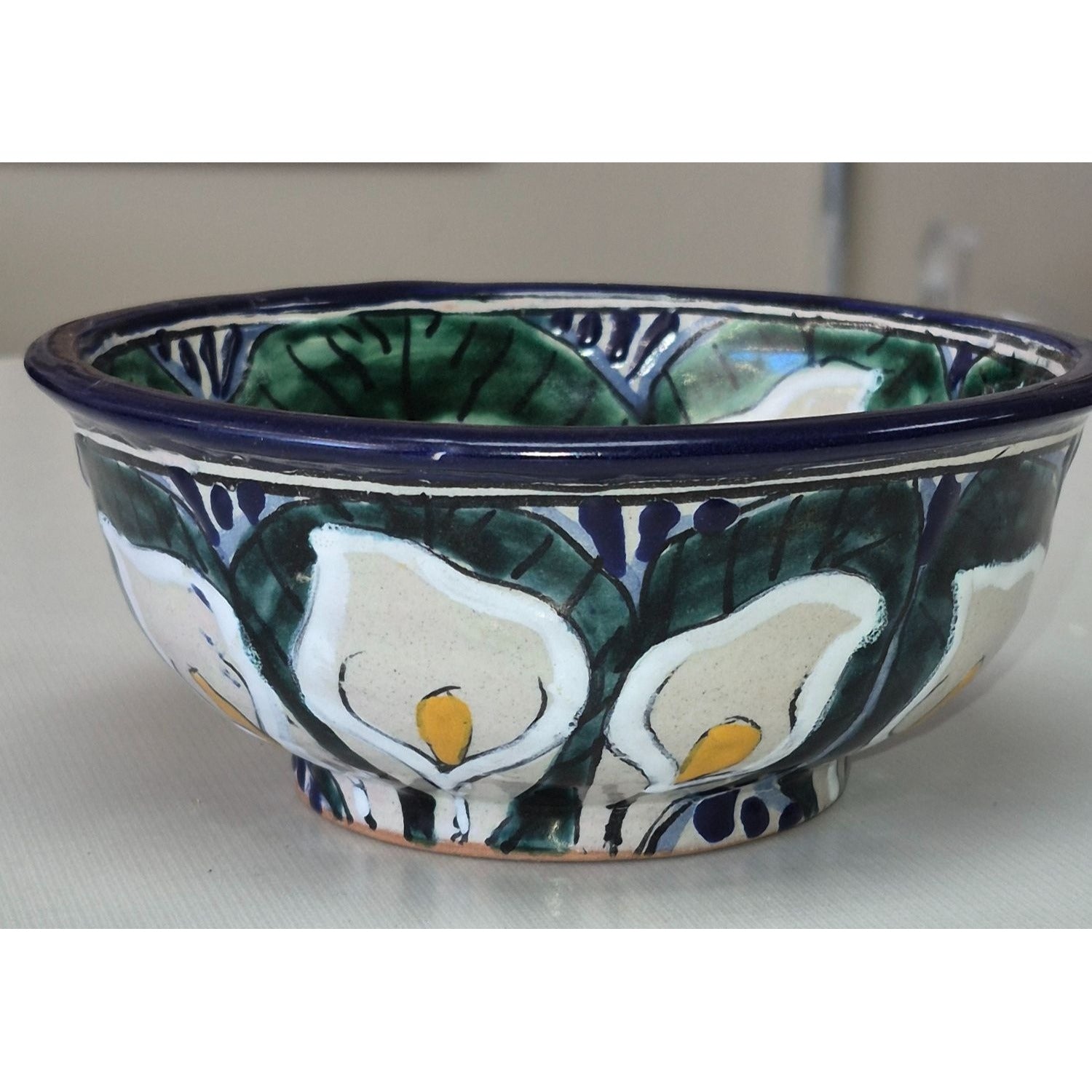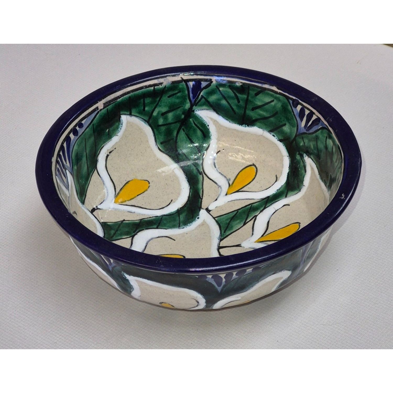Bring warmth and artistry to your home with this stunning hand-painted ceramic bowl from Mundo de Azulejos, a celebrated name in Mexican folk pottery. Featuring elegant white calla lilies with vibrant yellow centers and lush green leaves, this piece is a beautiful example of Talavera craftsmanship.