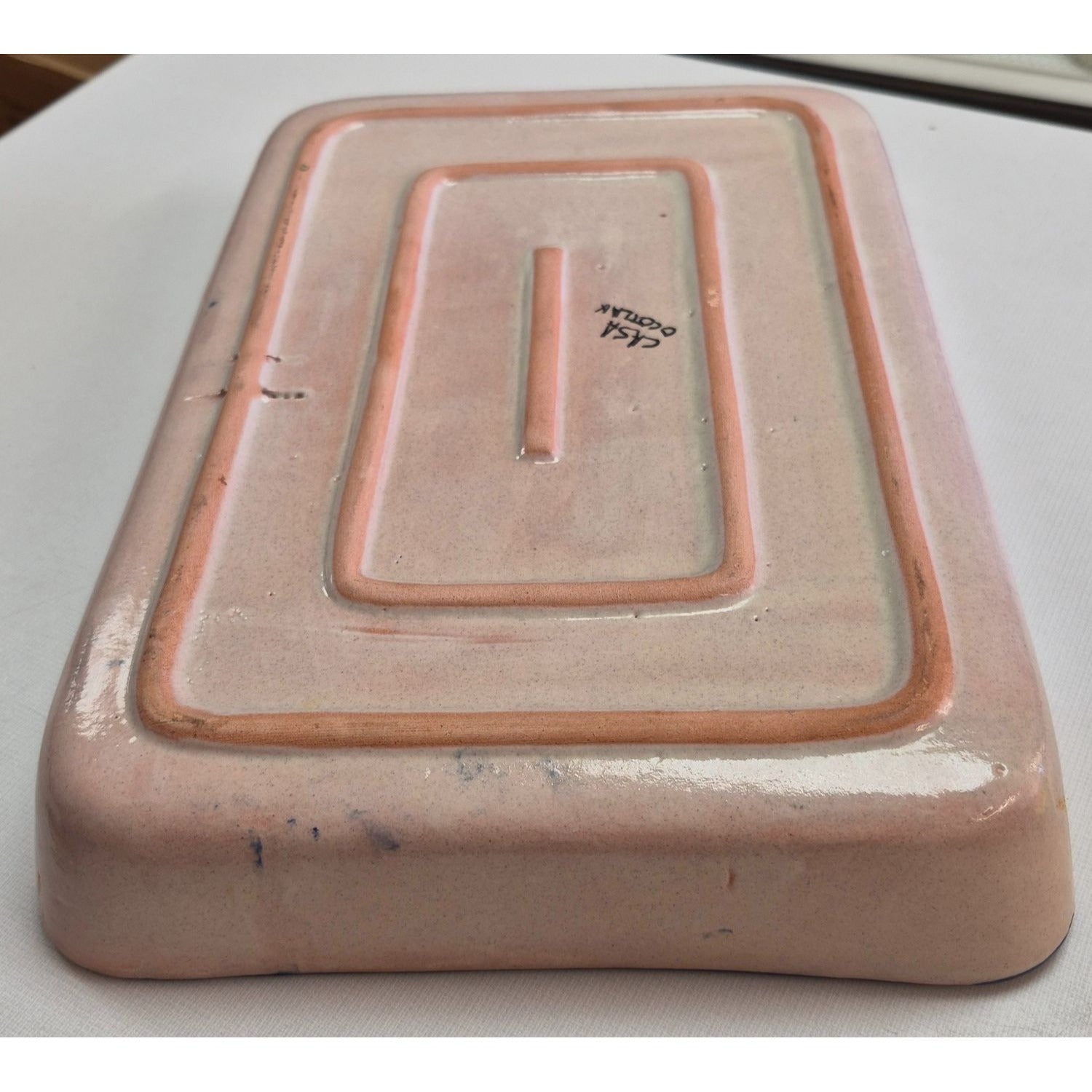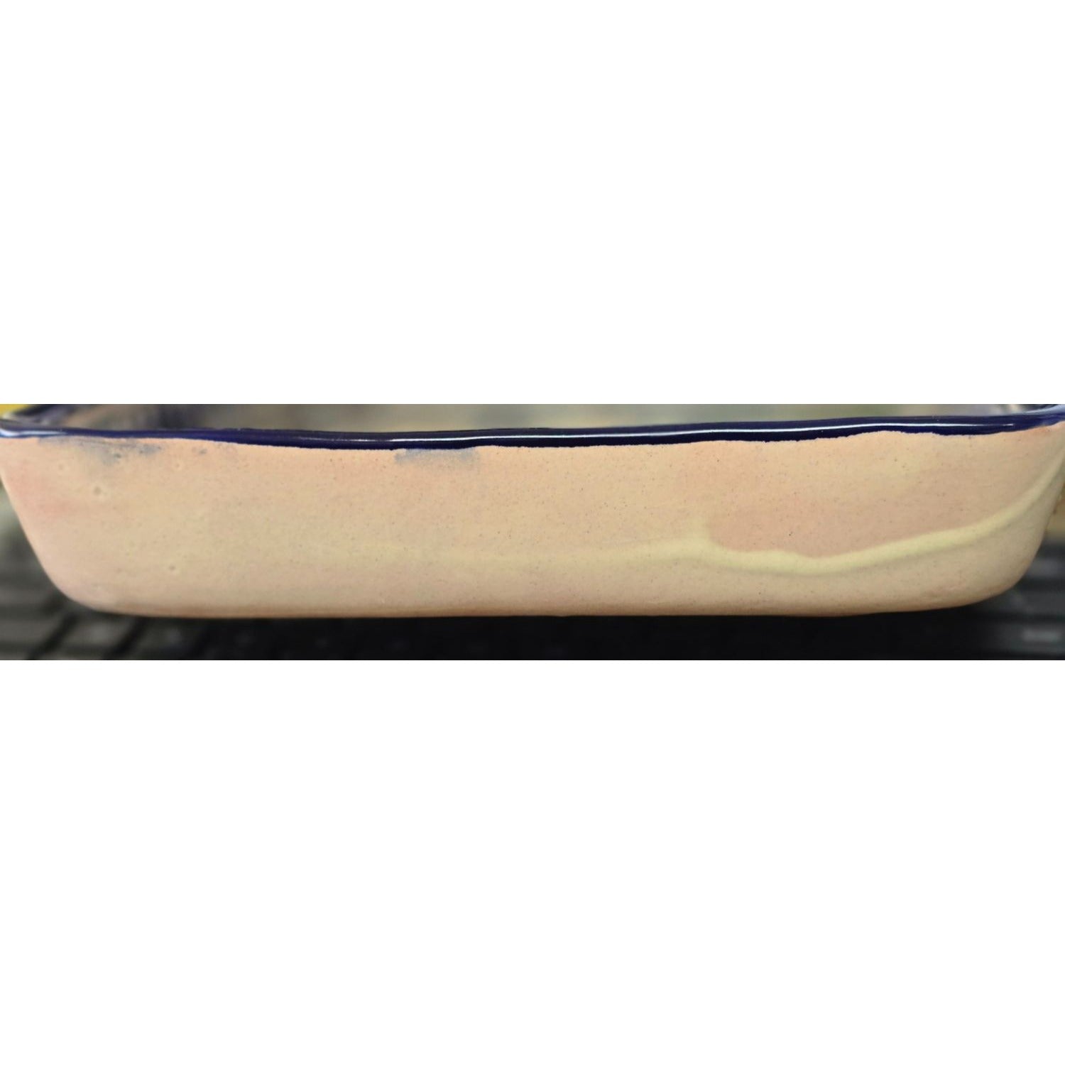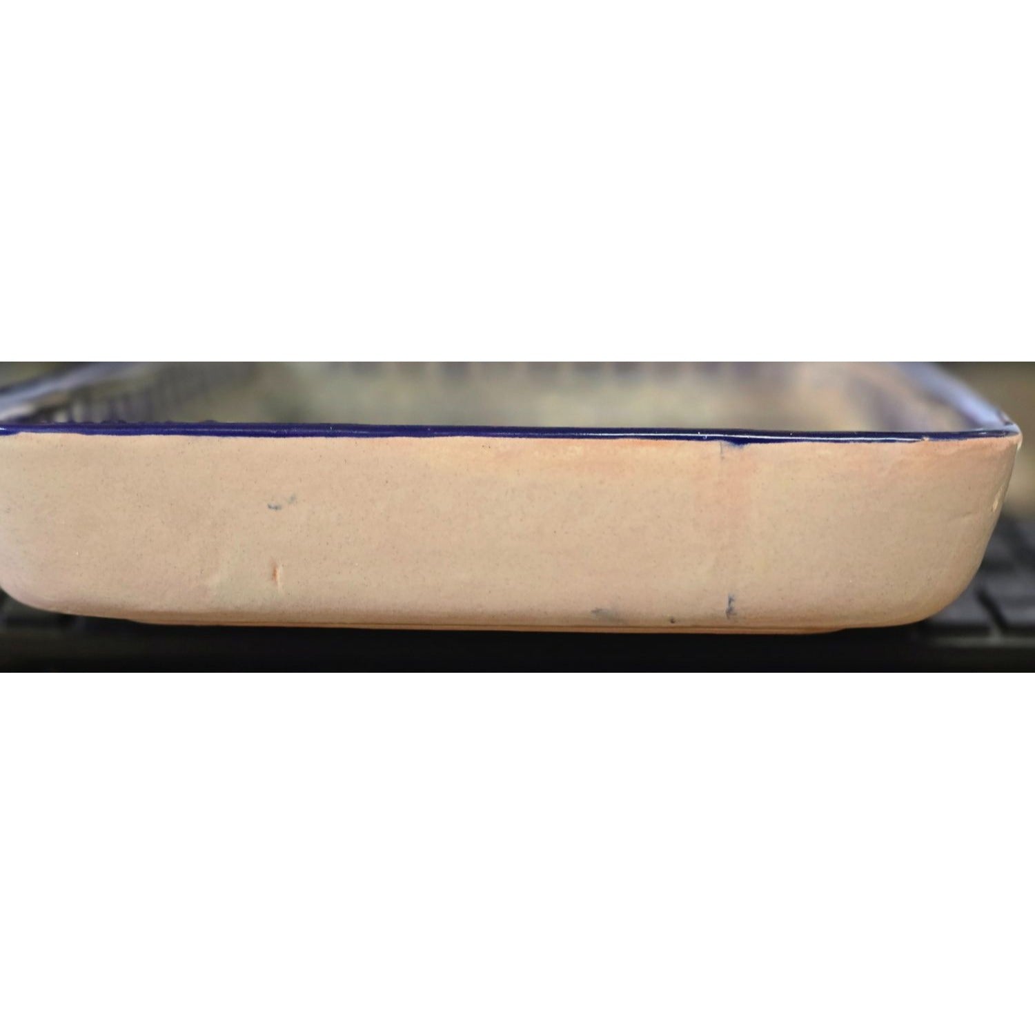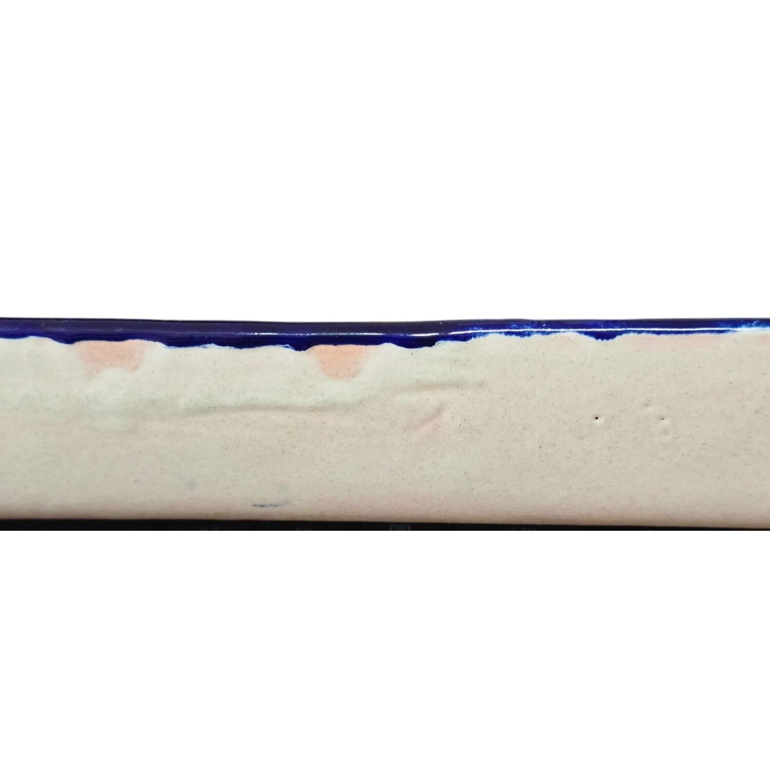 With its soft pink glaze and bold blue rim, this 13" x 9" dish is perfect for serving, styling, or simply admiring. The hand-finished details and subtle imperfections speak to its authenticity and charm. Small mark where glaze/paint did not touch the pottery. See the photos.