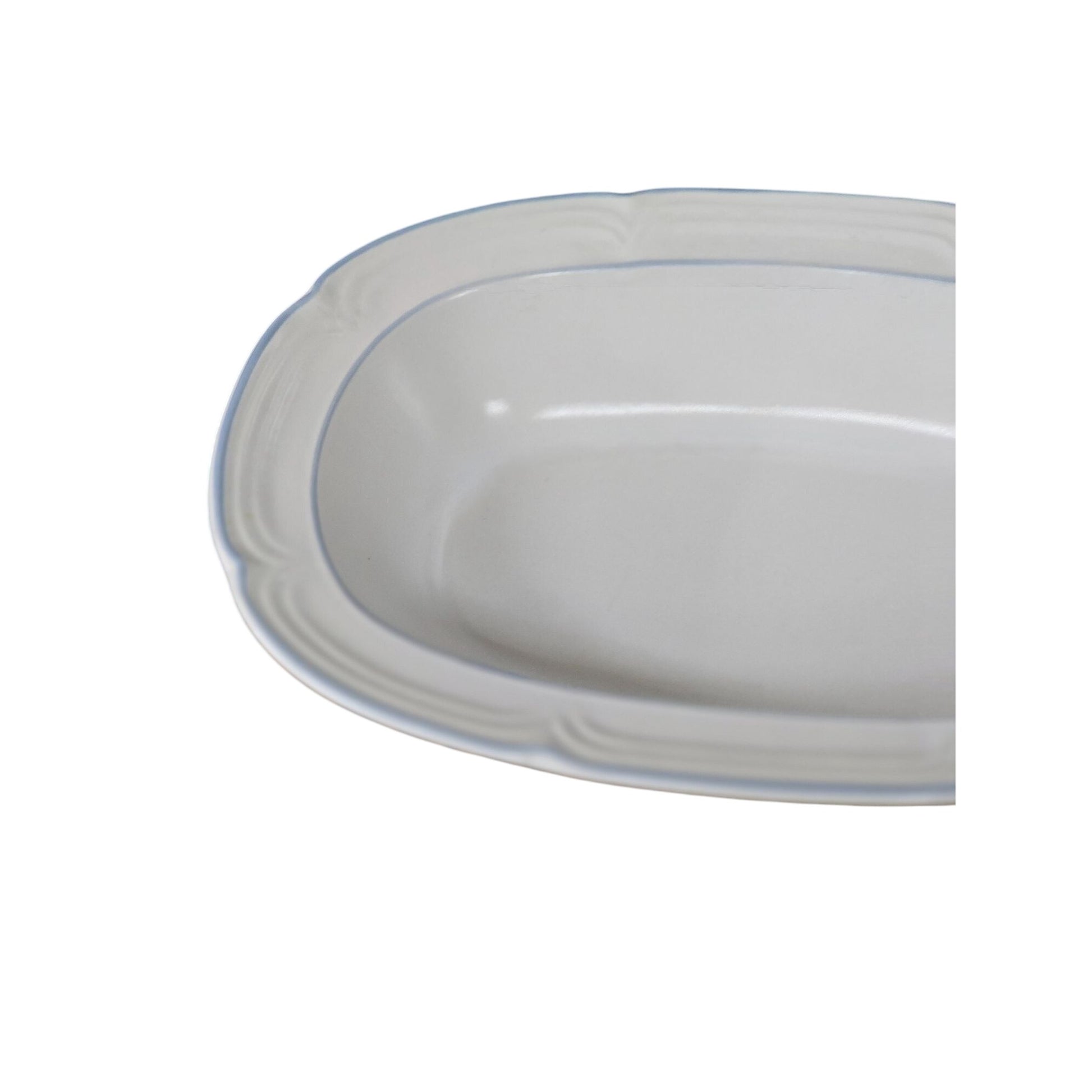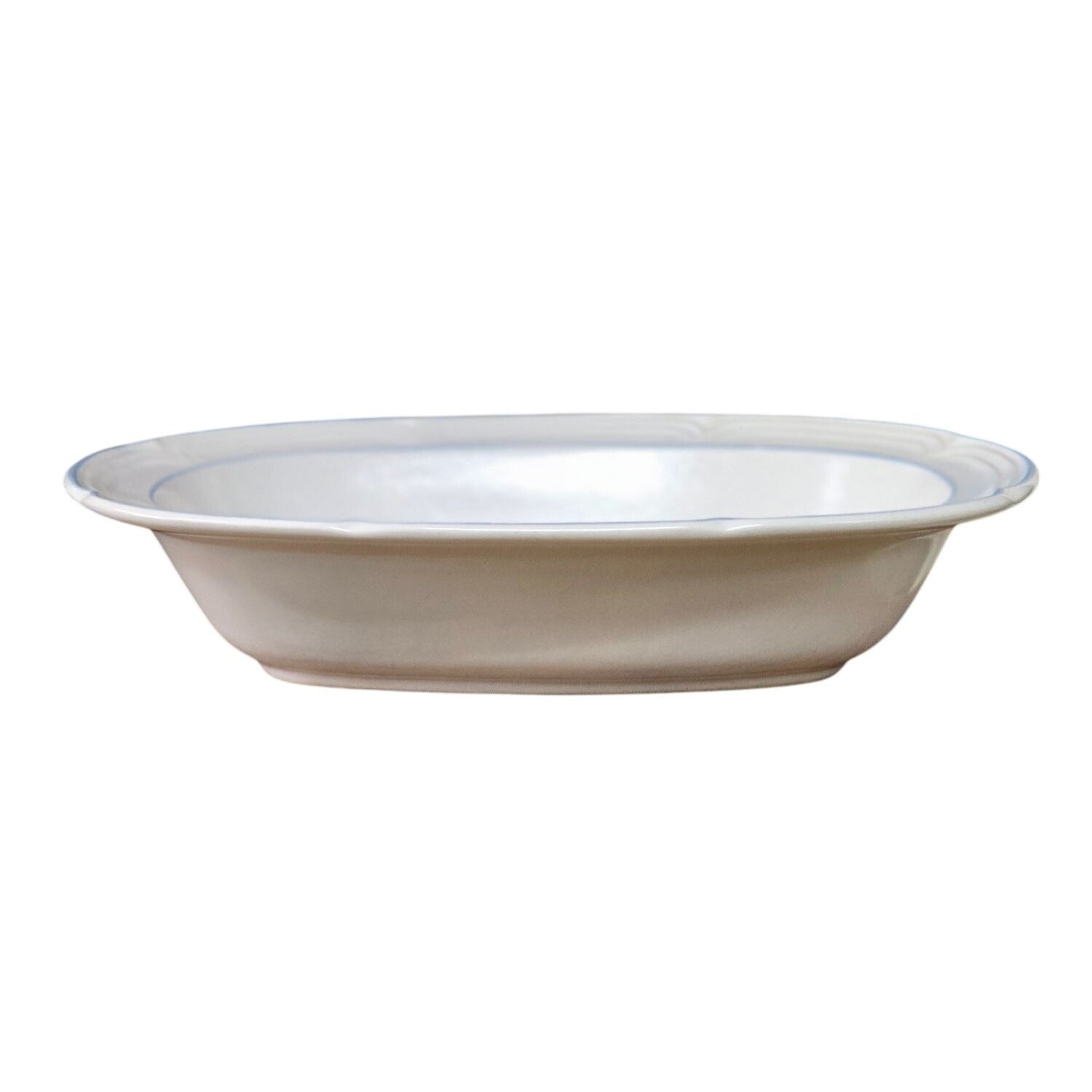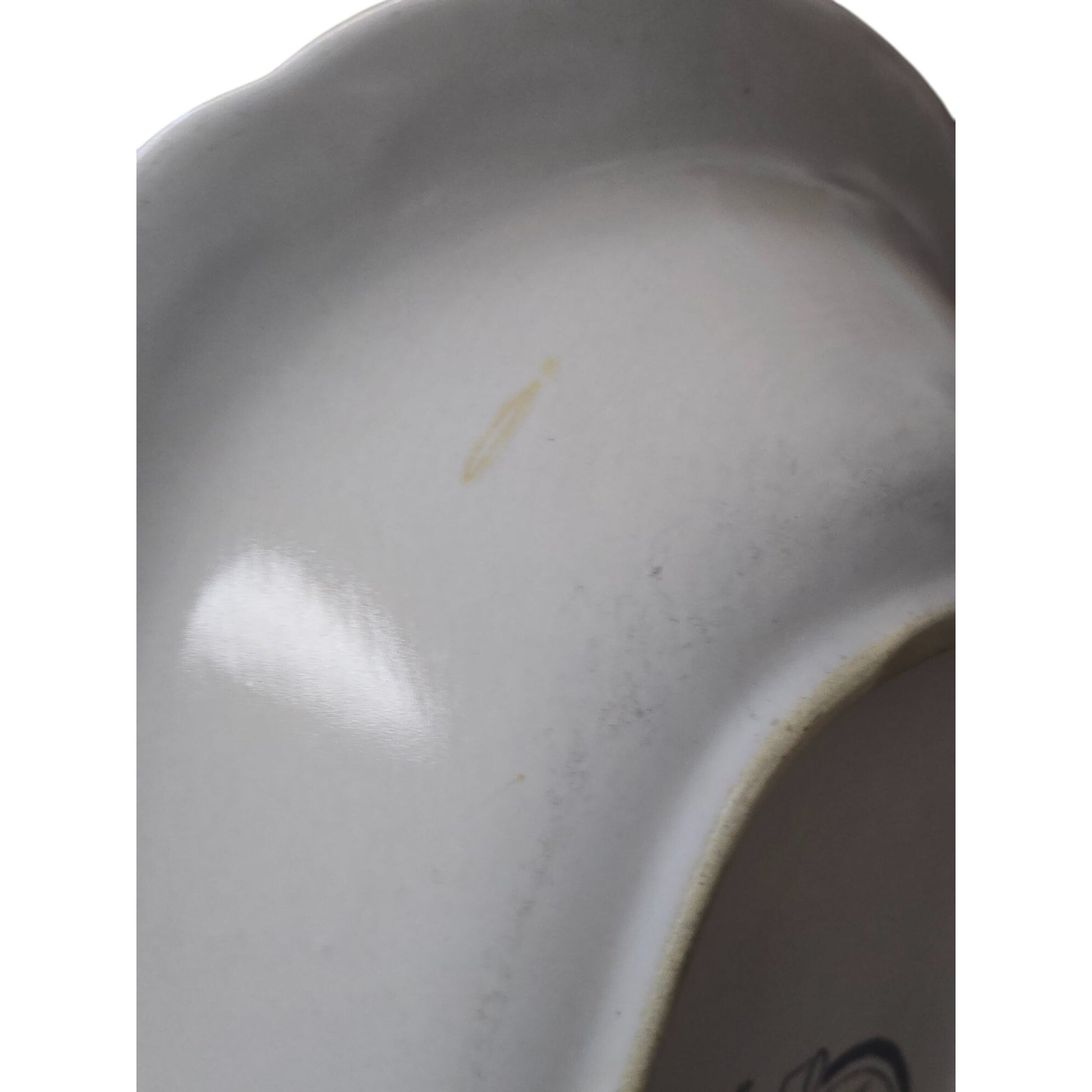 This vintage oval serving bowl from The Covington by Homer Laughlin offers a charming aesthetic. The stoneware is durable, perfect for serving your favorite dishes. Its elegant white and blue design with a scalloped edge adds timeless class to any table setting.