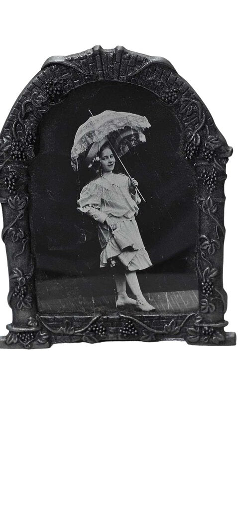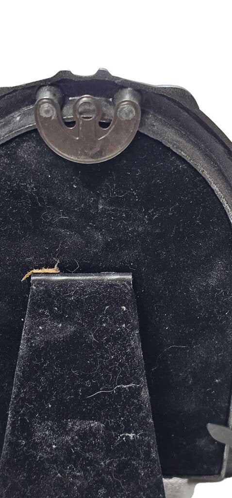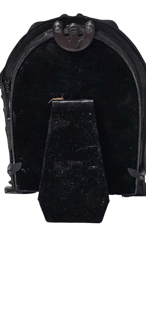 Preowned frame. Arched top. Holds photo approximately 3.5" x 5" . Can stand or be hung on the wall. Nice condition.
