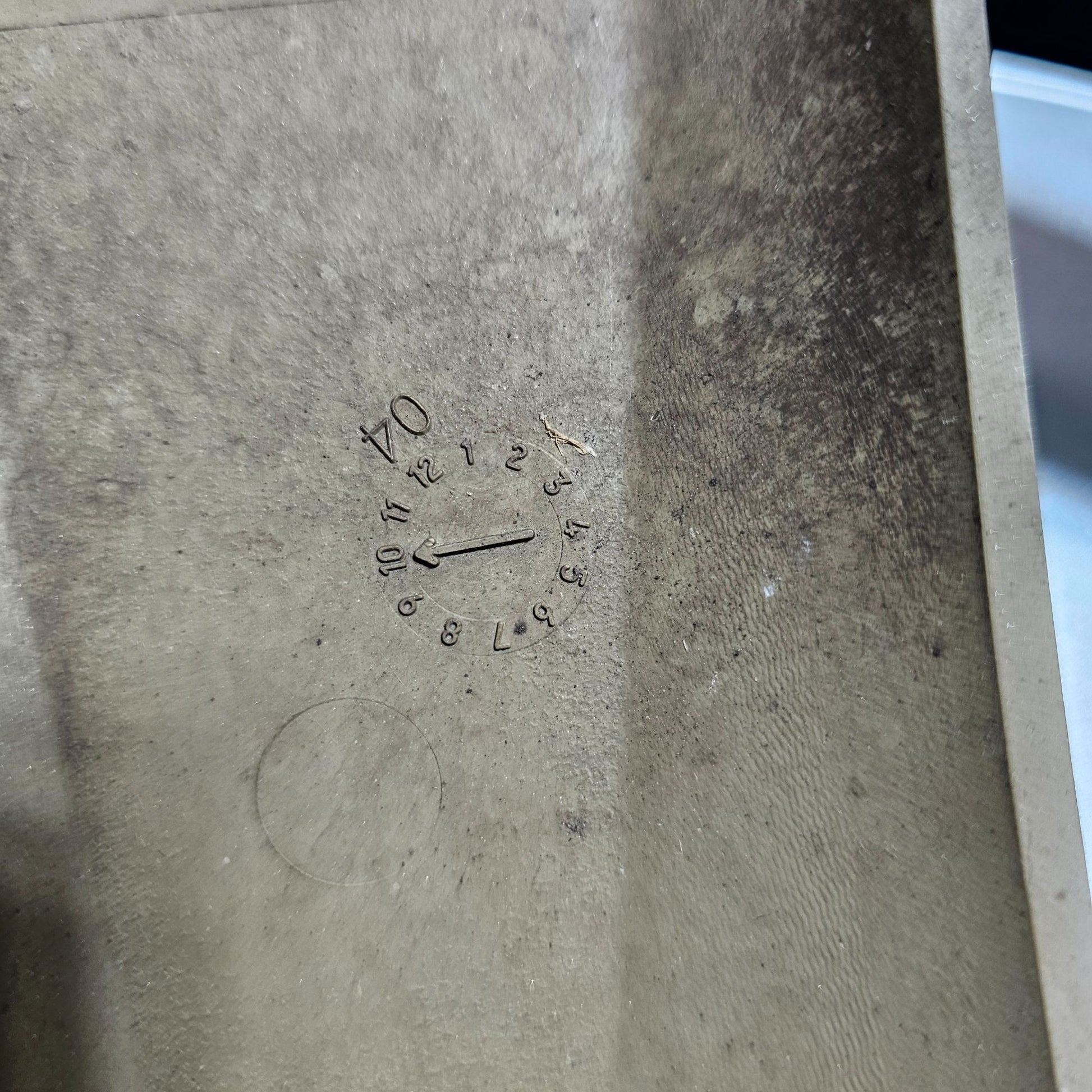 Minor scratches and wear on the front. Backside has dirt and grime buildup. Diameter = 16 inches.