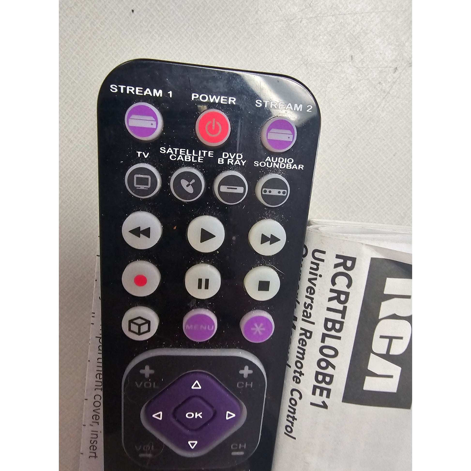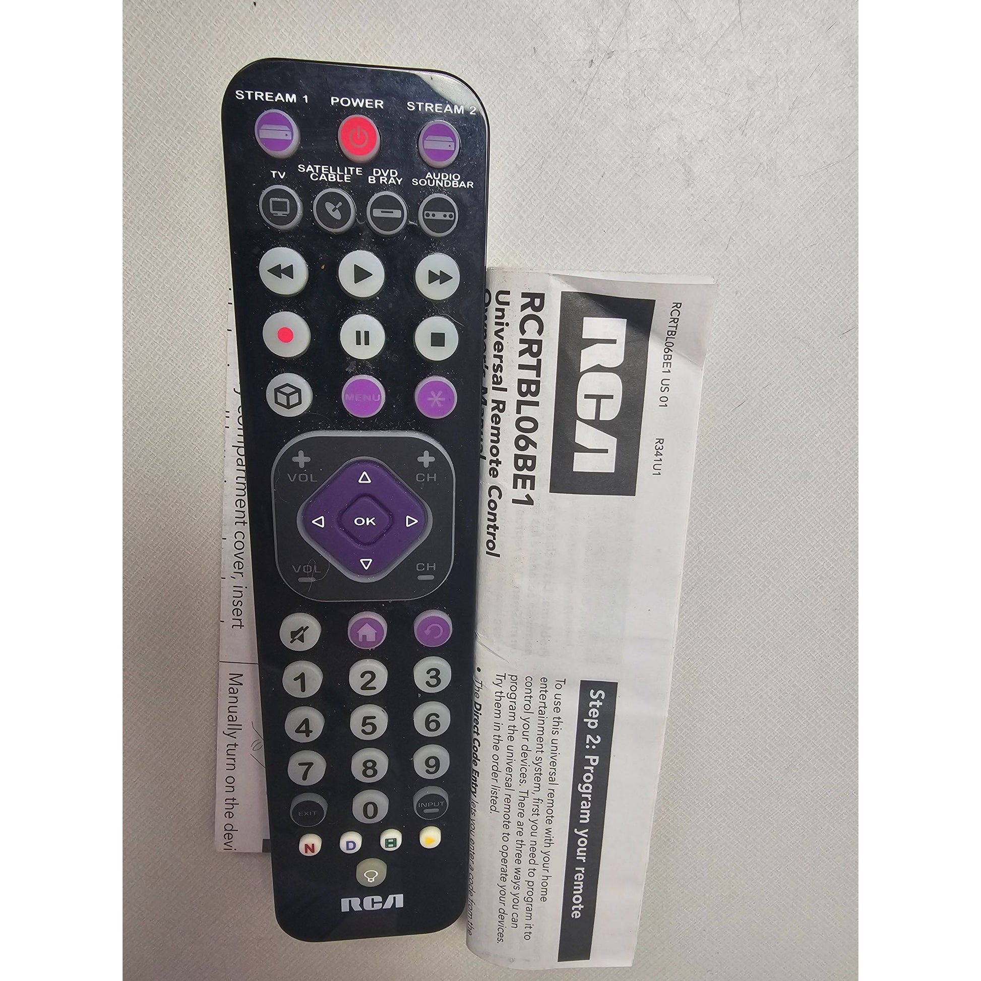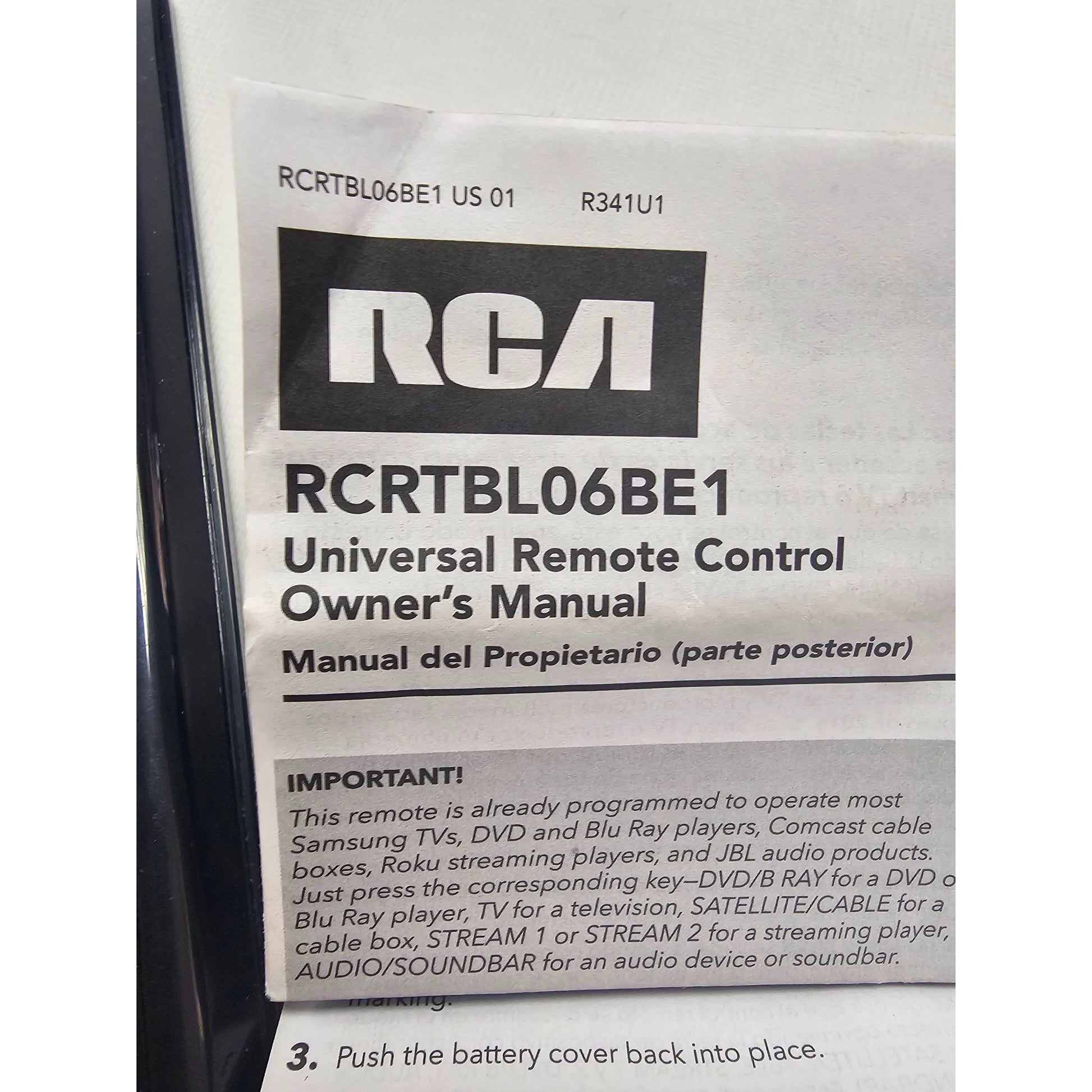 Effortlessly control multiple devices with the RCA Universal Remote RCRTB06BE1. Pre-installed batteries and included manual ensure seamless setup for TVs, DVDs, and more.