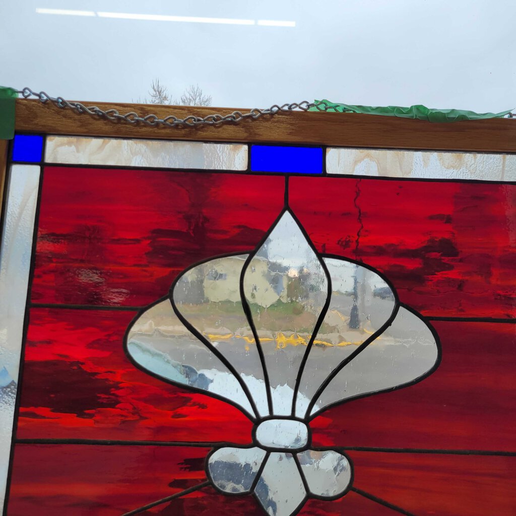 Brand new handmade red, white and blue stained-glass window hanging. Measures 17" high by 21.5" wide and is 1.5" thick. Comes with a chain hanger.