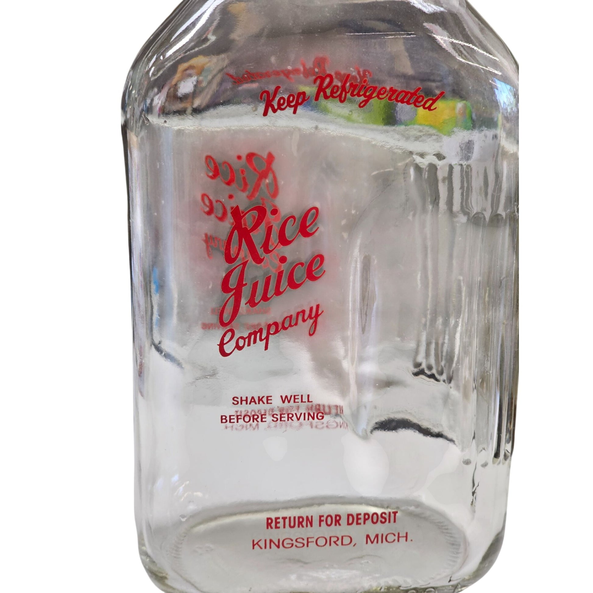 This Rice Juice Company glass bottle is a unique collectible piece perfect for adding a touch of rustic charm to your space. It features a classic design with clear glass and bold red lettering, making it both functional and decorative. Ideal for enthusiasts of vintage kitchenware and collectors alike.