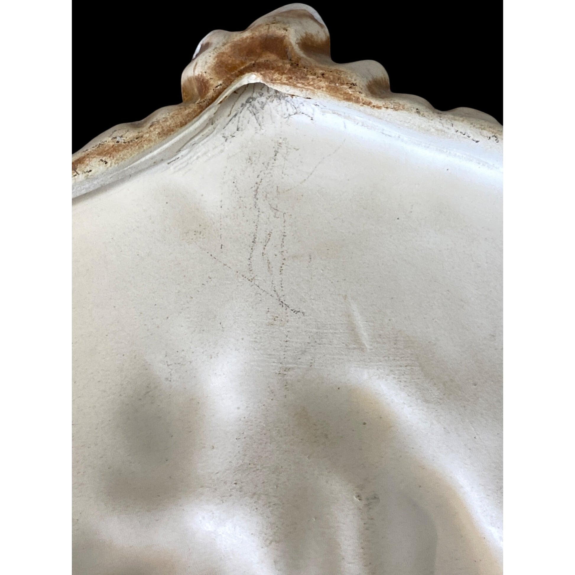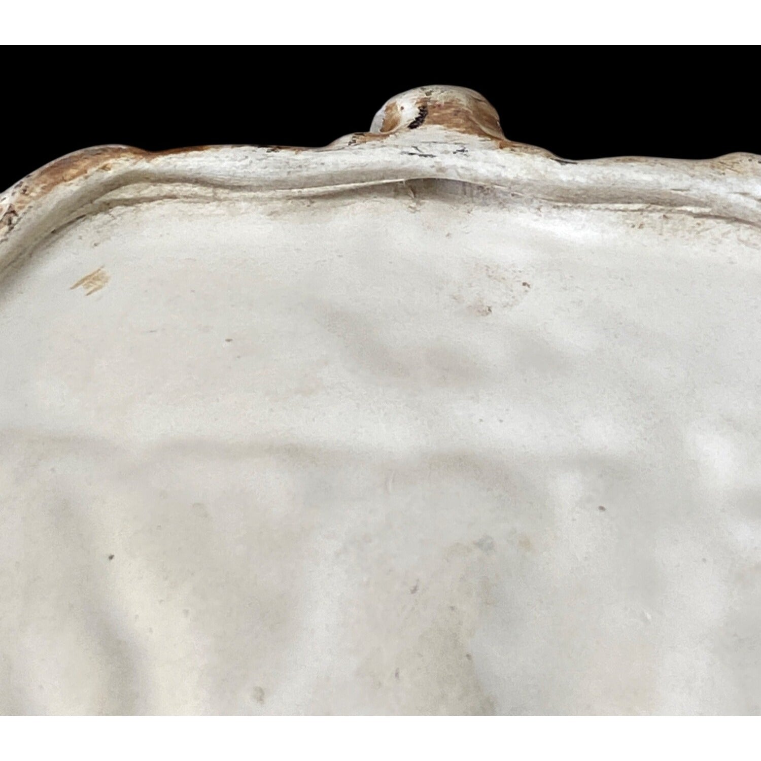 Step into a scene of timeless tenderness with this matched pair of vintage bisque ceramic wall plaques. Each features a softly sculpted romantic couple in flowing classical attire—captured in gentle conversation and framed by ornate scrollwork. The edges are adorned with cherub-like ornamentation: rounded faces and angelic forms nestled into the decorative border, reminiscent of classical putti.