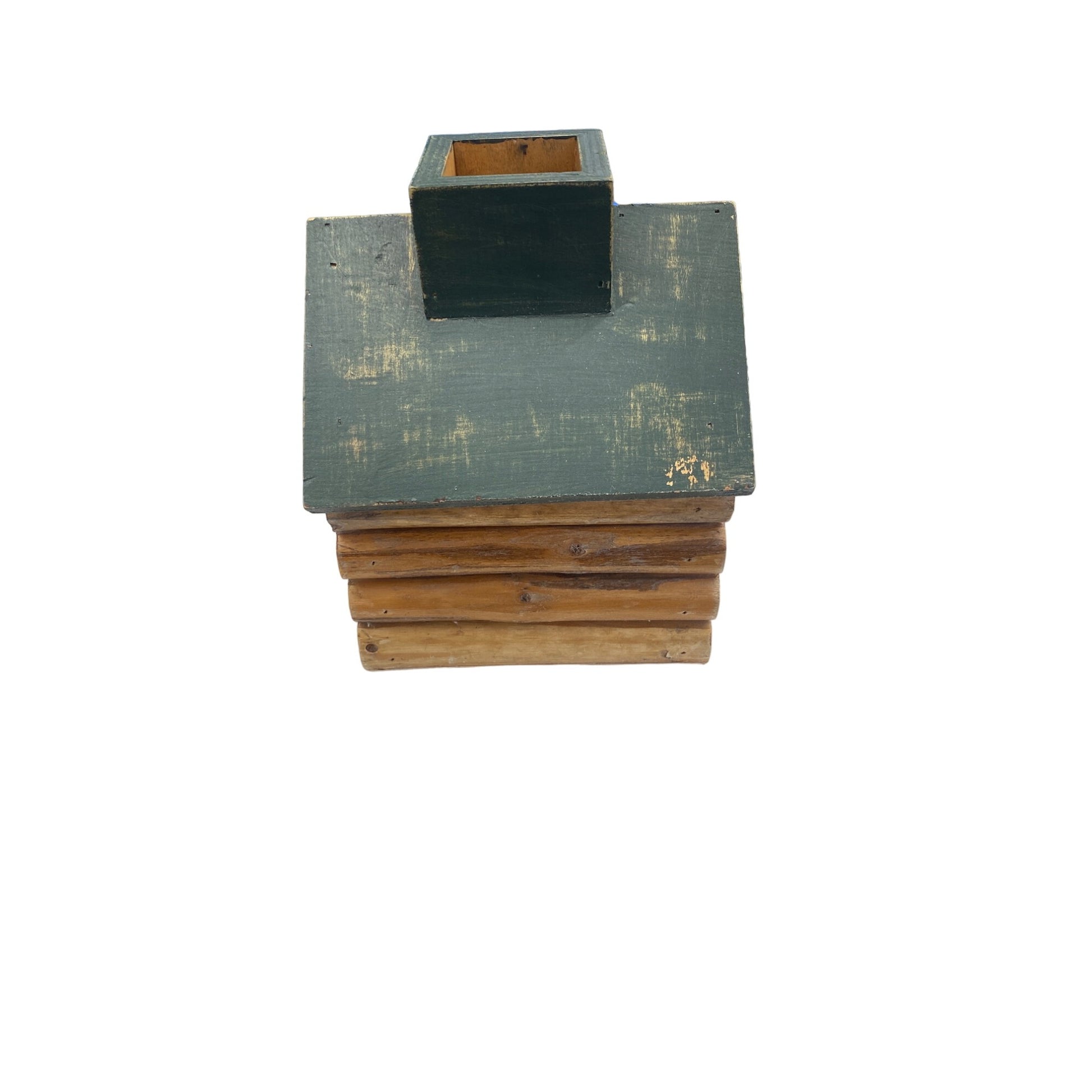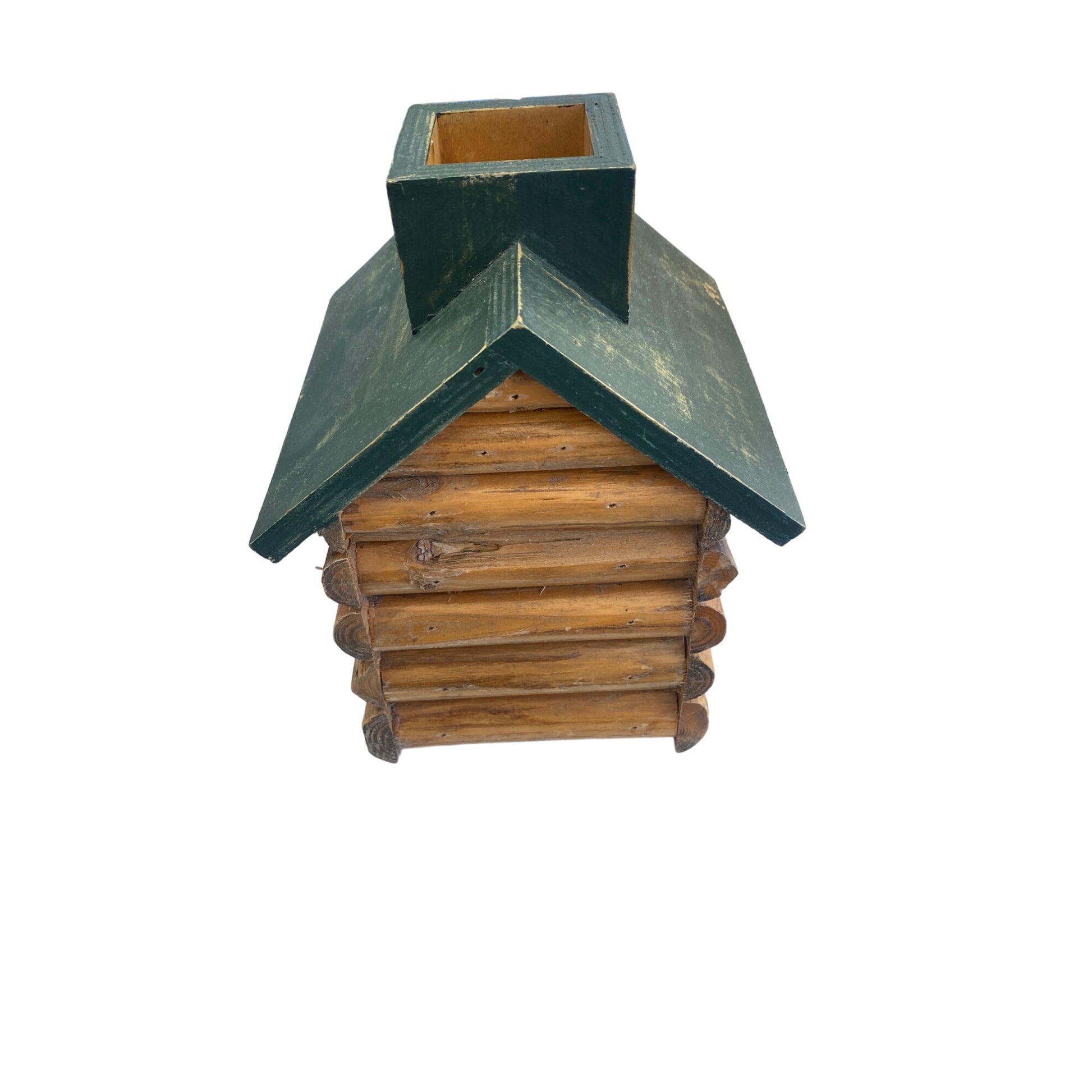 Enhance your outdoor space with this charming handcrafted birdhouse. Its rustic log cabin design, complemented by a weathered green finish, adds character to any garden. Ideal for bird enthusiasts seeking to attract feathered friends, this birdhouse provides both shelter and decorative appeal.