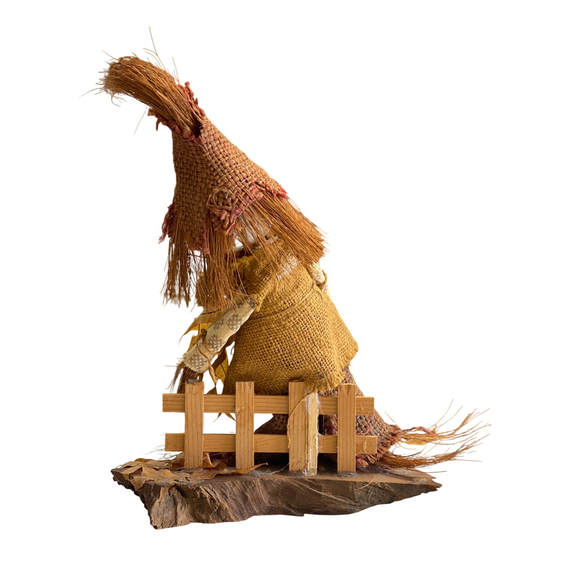 Add this charming handcrafted scarecrow figure to your decor to bring a touch of rustic charm and whimsy to your space. Perfect for adding a cozy, welcoming feel to any room, this delightful piece stands firmly on a wooden base, adorned with a cute hat and pumpkin details.