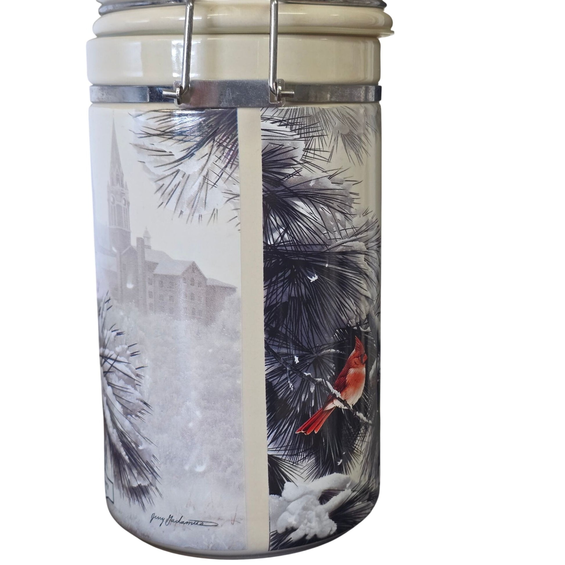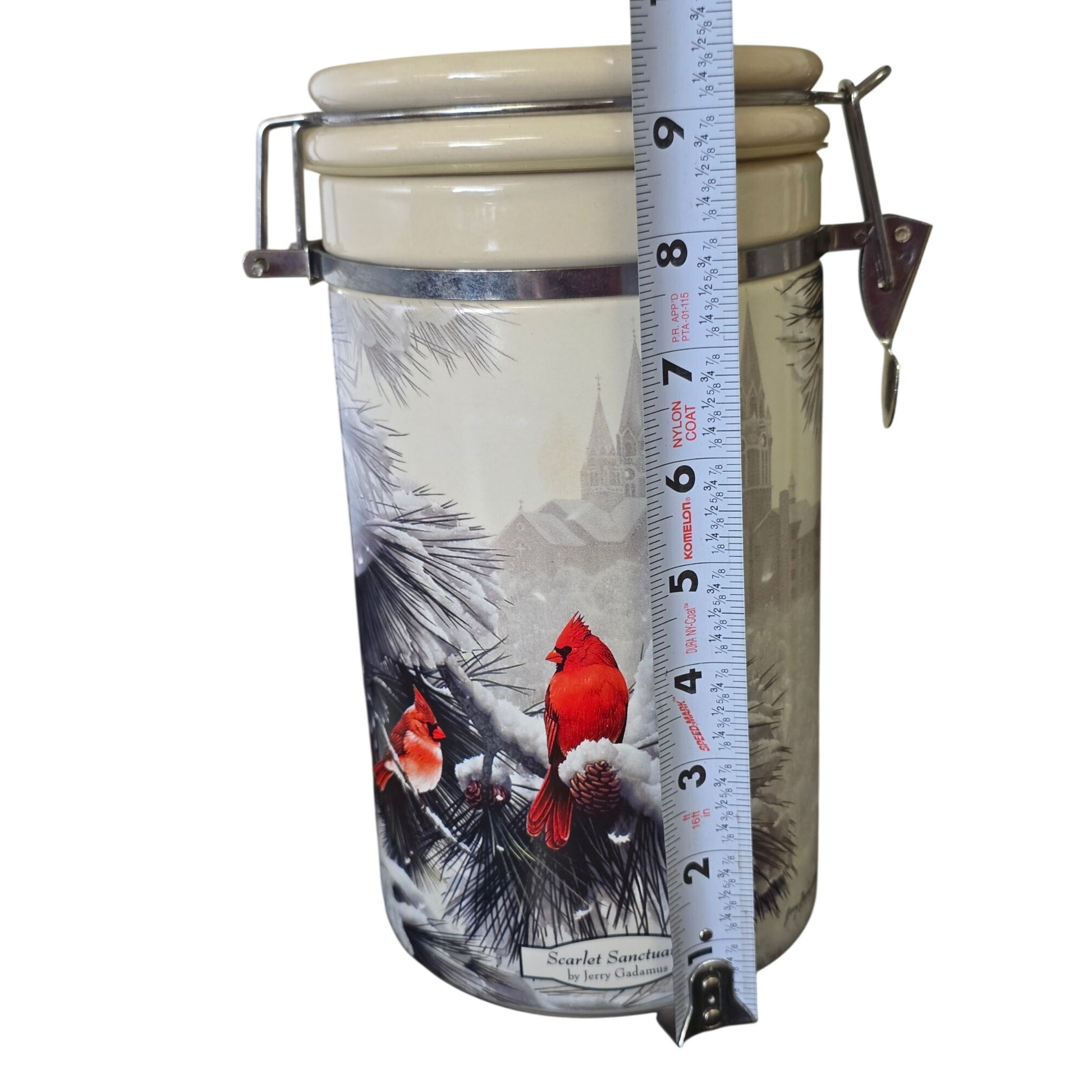 This ceramic canister features a vibrant cardinal design by Jerry Gadamus, perfect for adding charm and functionality to your kitchen or display space.