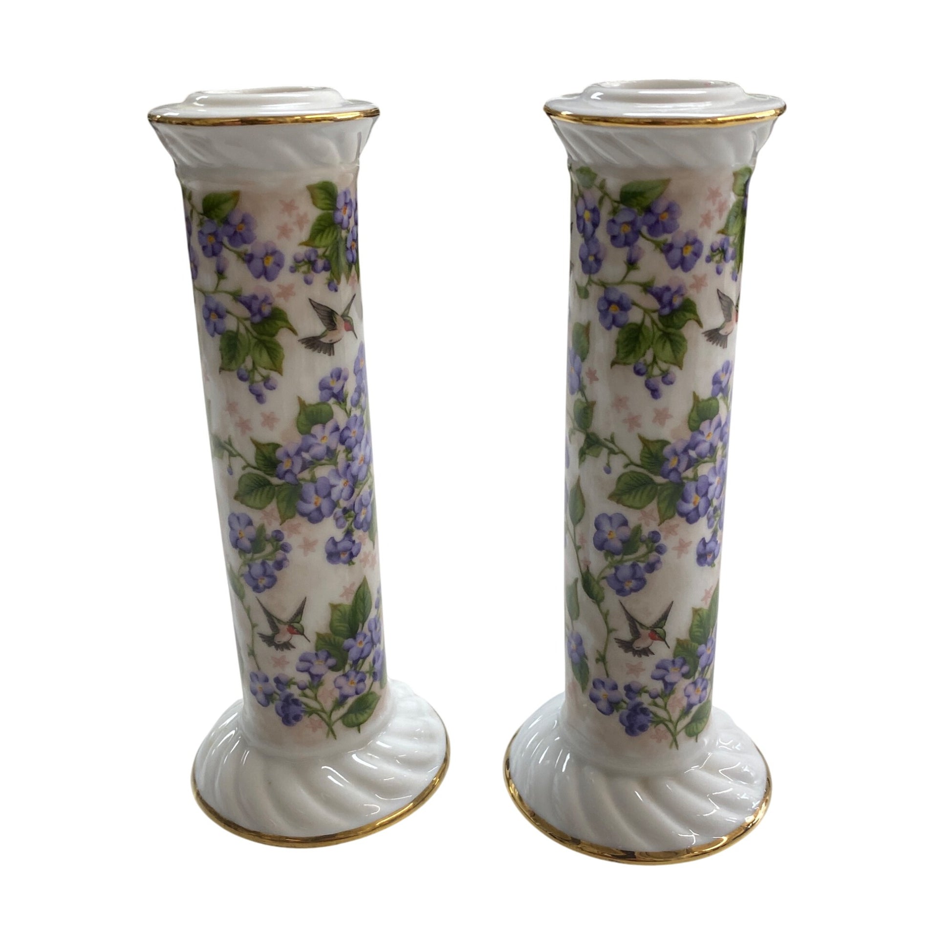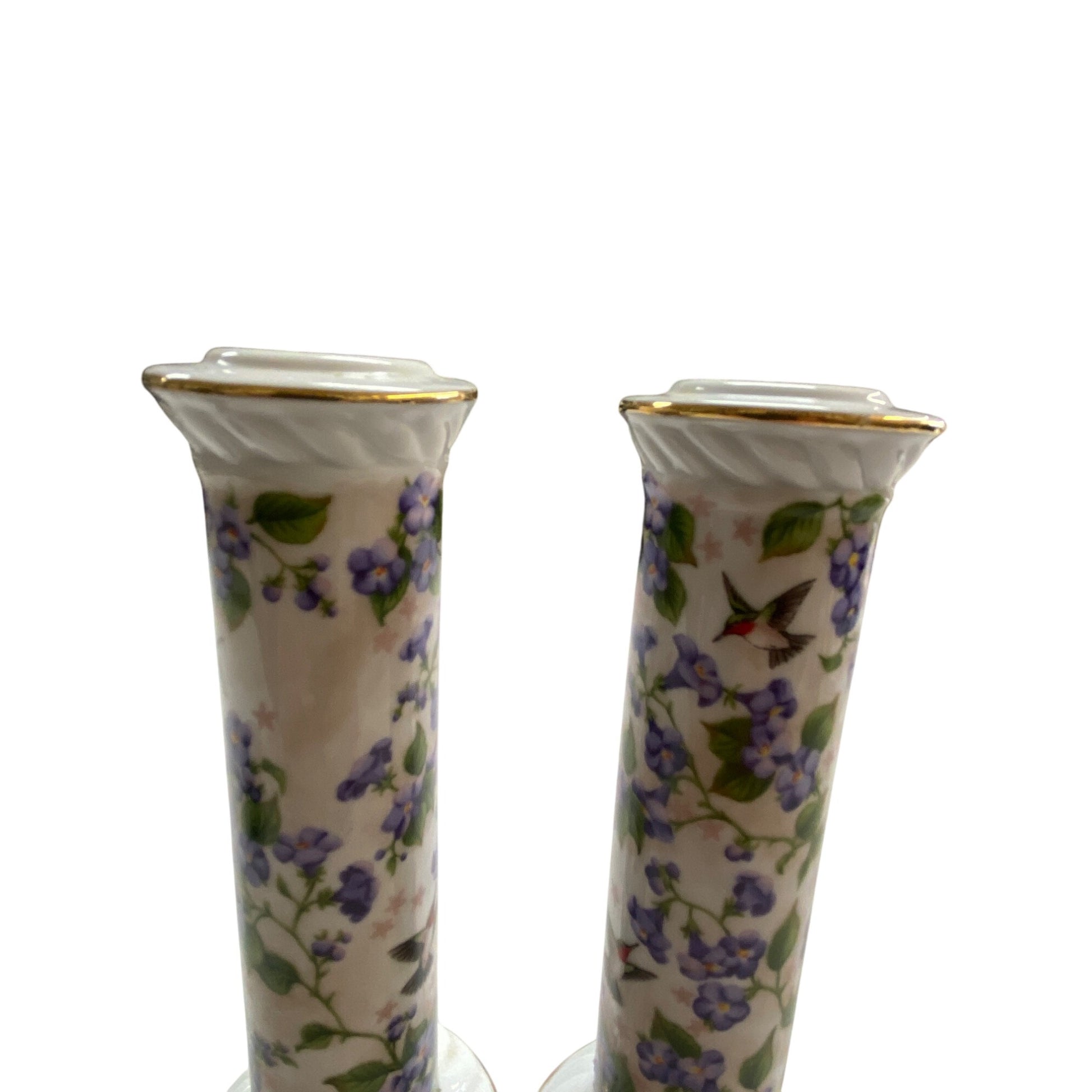 Elevate your home décor with these elegant porcelain candle holders. The timeless floral and hummingbird pattern, accented with gold trim, creates a stunning display.