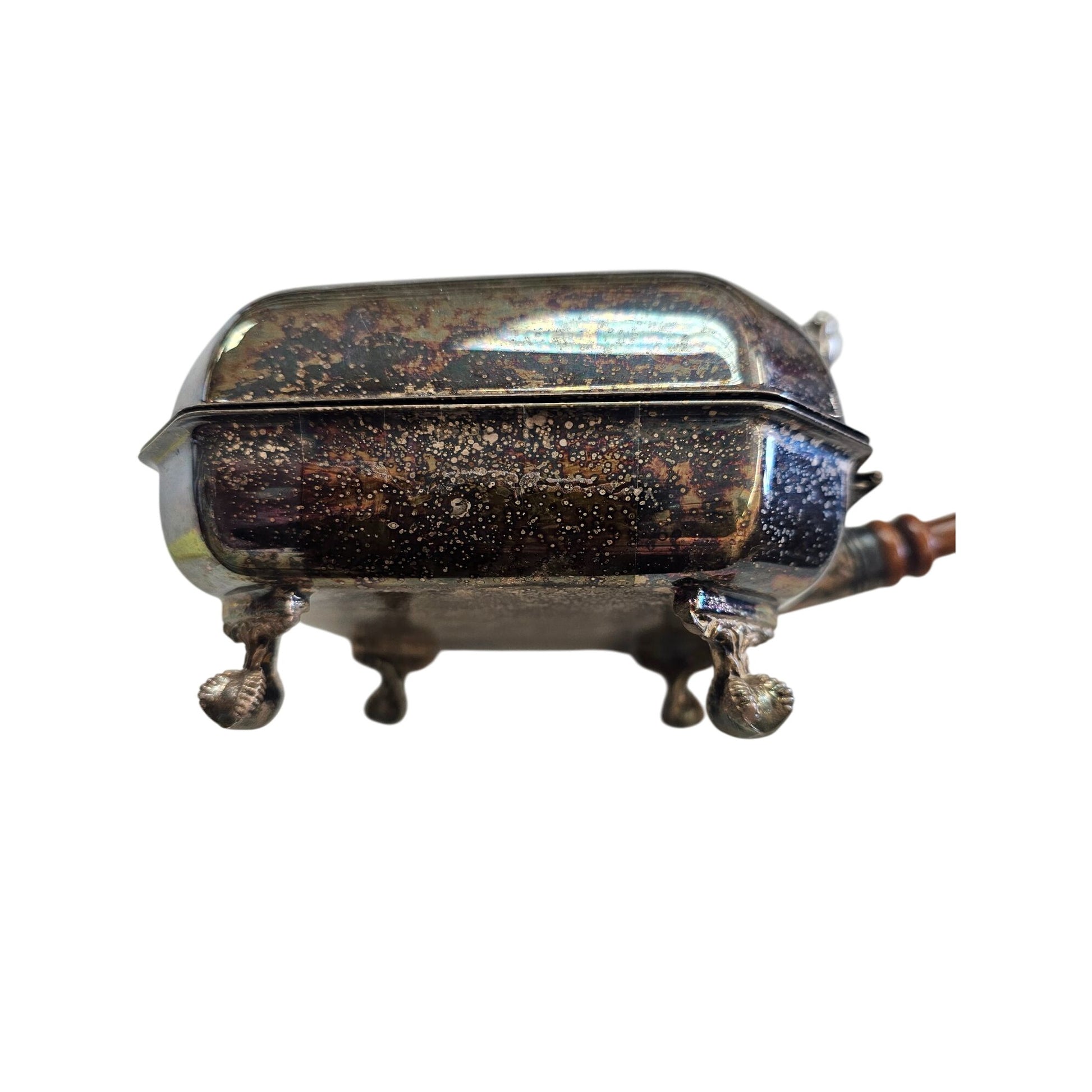 Elevate your table setting with this elegant silver-plated butter dish, silent butler crumb catcher. Featuring a wooden handle, intricate shell detail, and a glass insert, it adds sophistication to any meal.