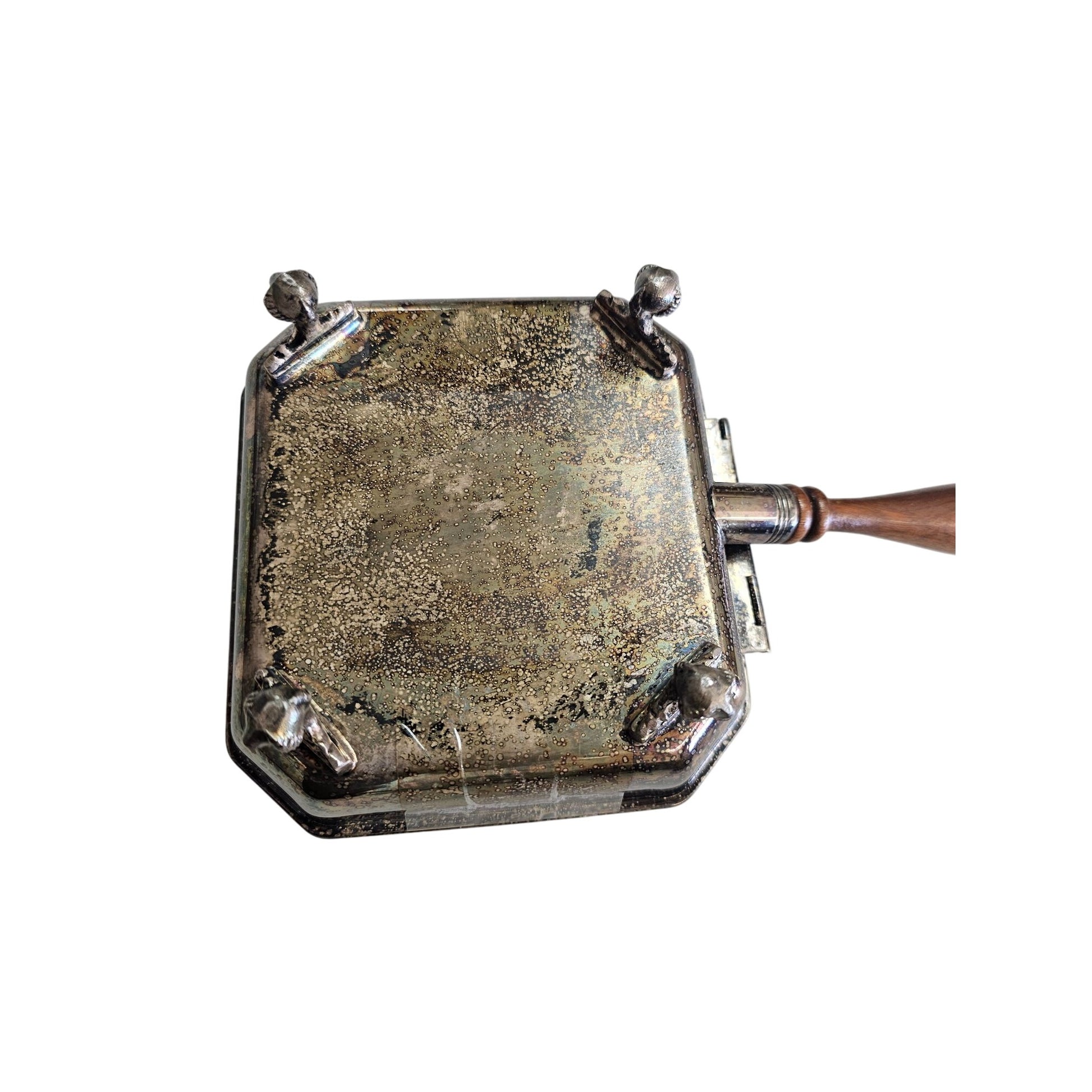 Visible tarnish and patina throughout. Light wear on the bottom. Top to bottom = 3 inches, width = 5 inches (10 inches with handle).