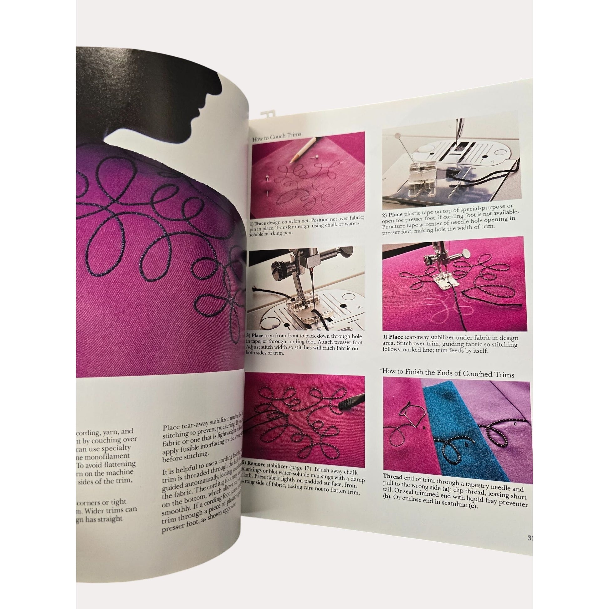 • Features hemstitching, appliqué, and couching techniques