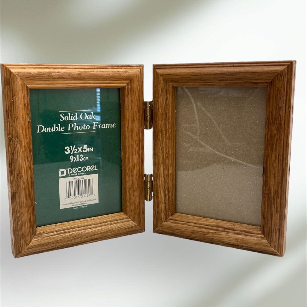 This a solid oak double photo frame that is connected by two hinges in the middle. It can fit two 3 1/2 x 5 inch photos in it. The frames are in good condition with, but one of the cardboard backs does have a few water stains.