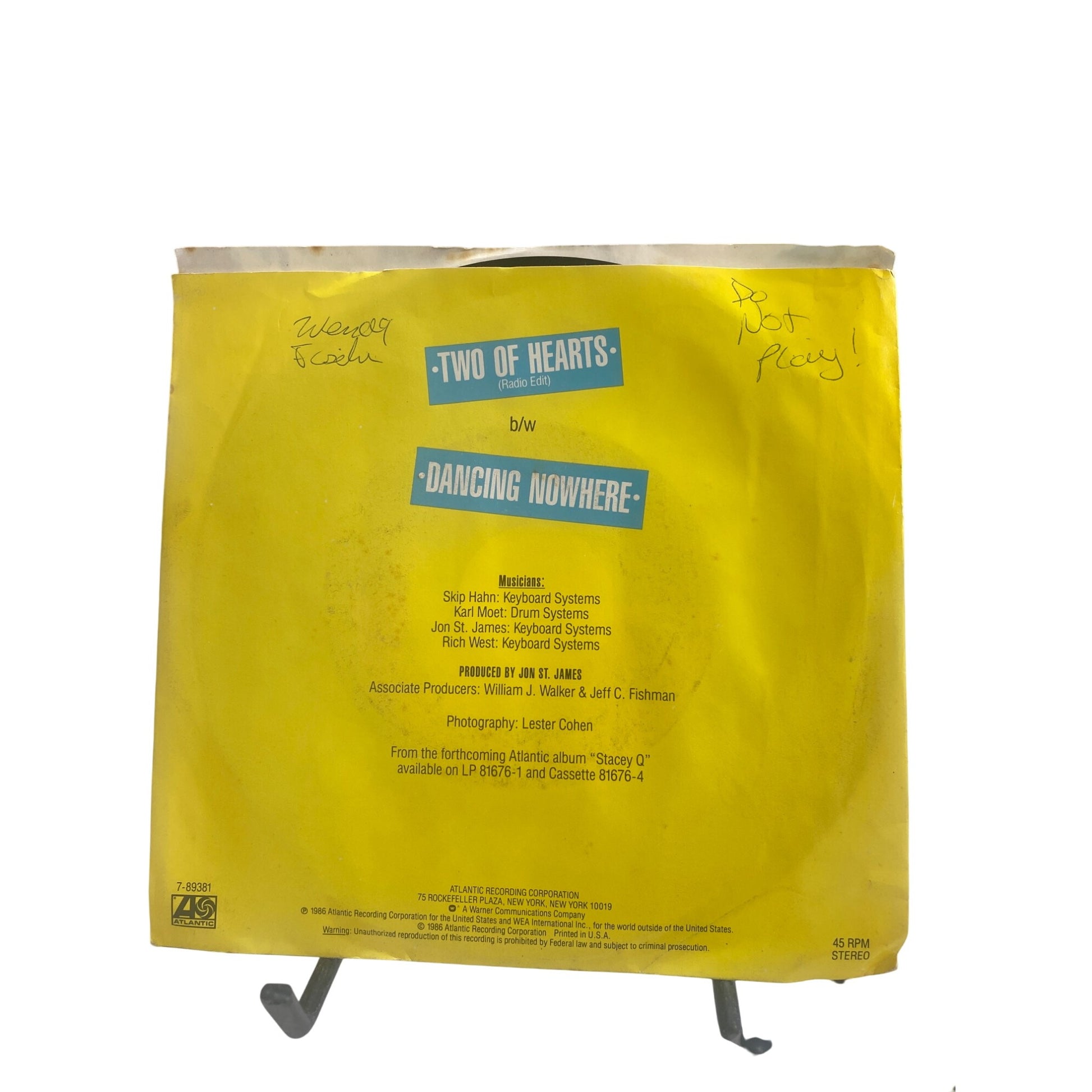 Enhance your music collection with this classic 45 RPM vinyl record from Stacey Q. Featuring the iconic hit "Two Of Hearts" and the B-side "Dancing Nowhere," this vintage collectible comes with a vibrant picture sleeve, adding value and nostalgia to your vinyl collection.