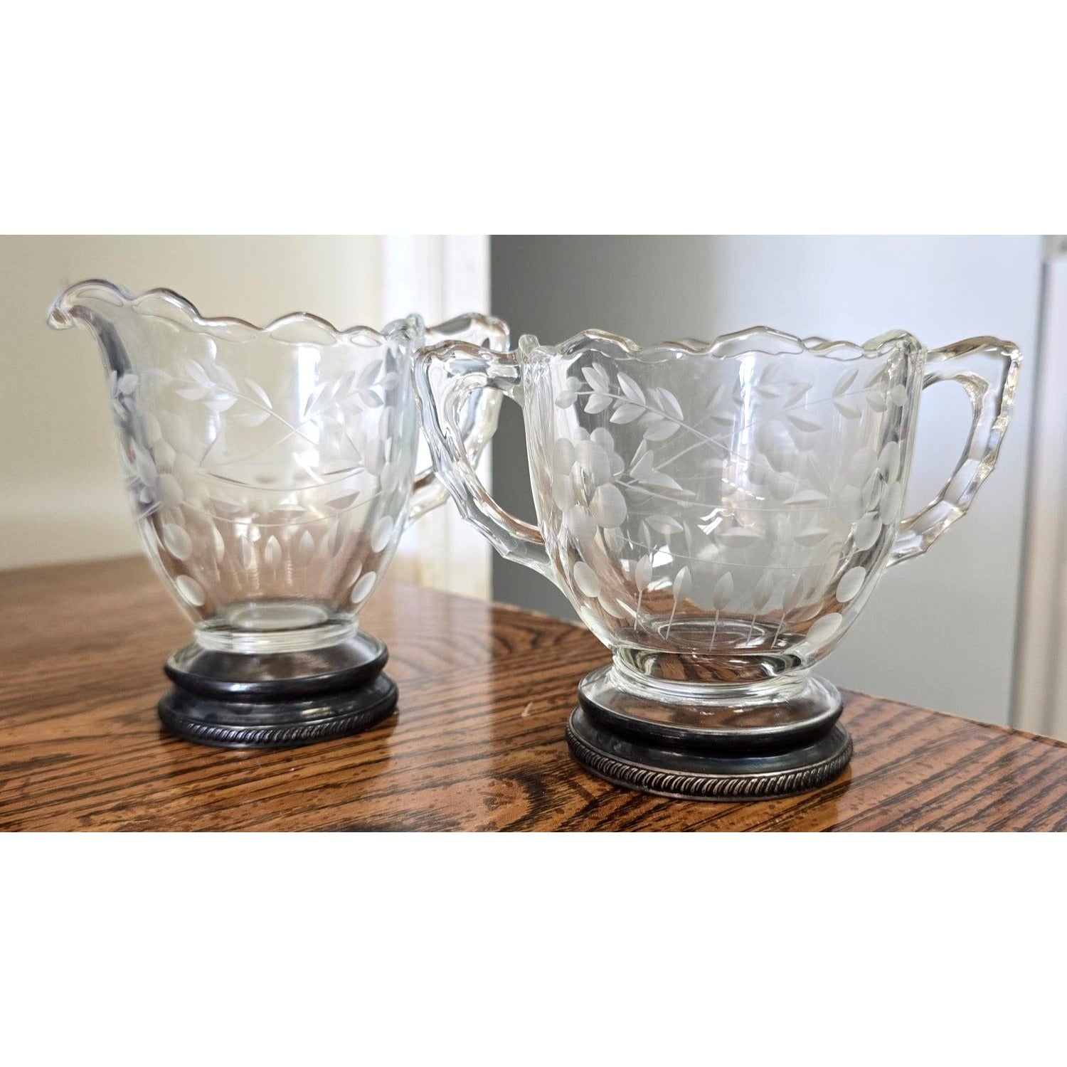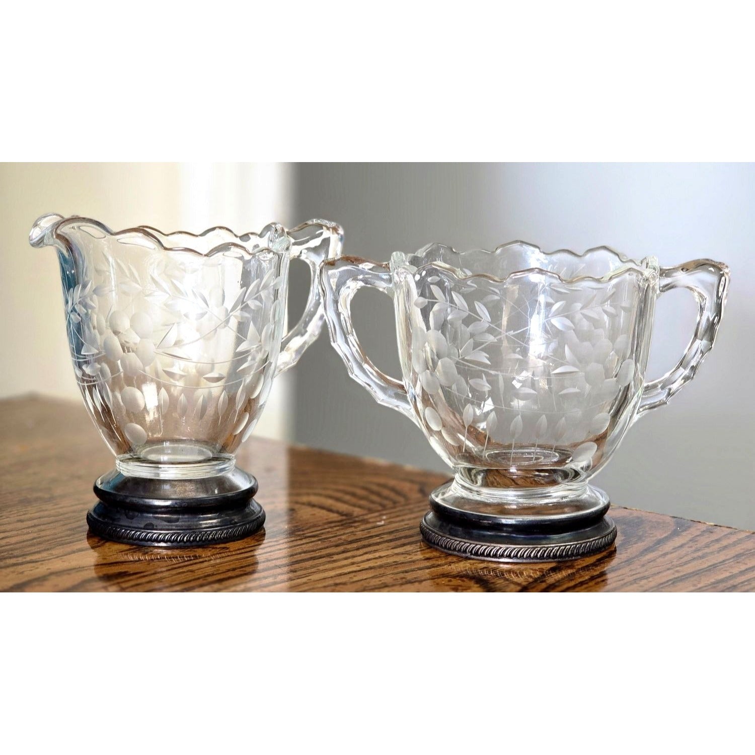 Elegant vintage sugar and creamer set with etched glass and sterling silver accents, perfect for adding a touch of sophistication to any table setting or collection.