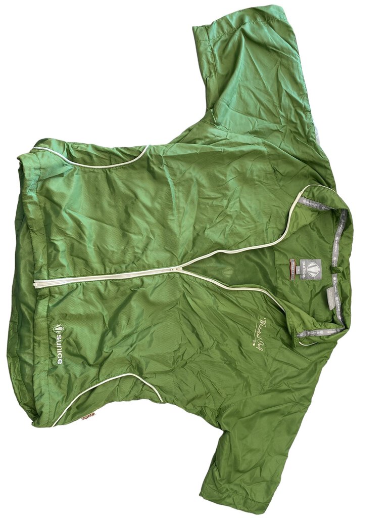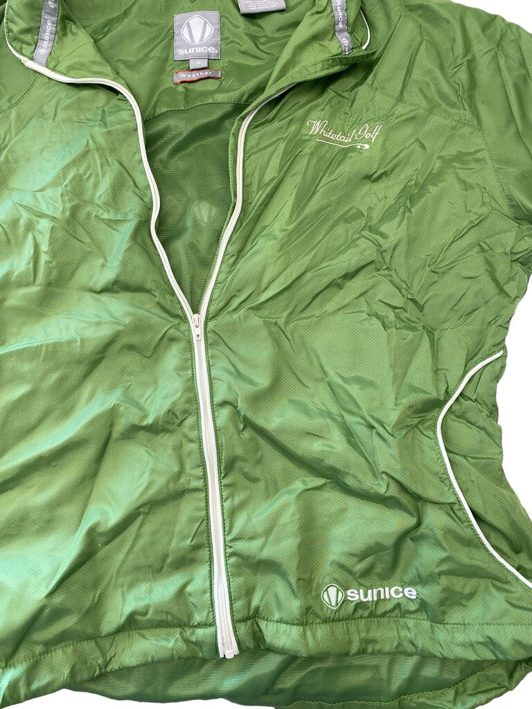 Sunice Women's Lightweight Gisele Golf Wind Shirt M Medium Short Sleeve Zip Up Jacket-Color Green. Like New, no visible wear or tear, no stains. Full Zip Up windshirt Women's size Medium. Color Green with White trim and accents. Features: Full Zip up, short sleeve, water repellent, wind proof, fully mesh lined inside, relaxed fit for optimal comfort while enjoying Golfing the day away in style. The Weather Collection offers the latest in lightweight, quiet, water repellent and highly breathable fabric. Outershirt is 100% nylon and full lining is 100% polyester stretch mesh that allows for you to get that master golf swing in and land you on the green! The Wx Tech fabric allows water to bead off the surface so rain or shine your game is still strong all day long. Casual spring sport basic sporty classic summer athletic activewear.