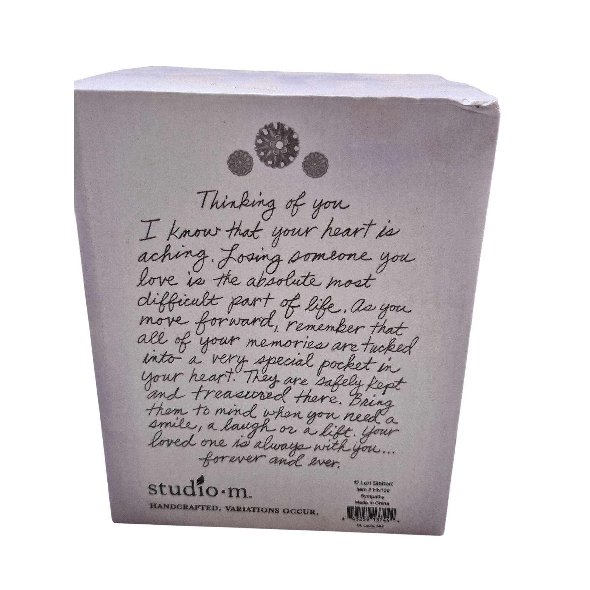 This charming ceramic bell, designed by Lori Siebert, offers a heartfelt touch to any space. With its soothing tones and sentimental message, it provides an elegant reminder of cherished memories. The intricate design and subtle color palette make it a beautiful addition to home decor or a thoughtful gift.