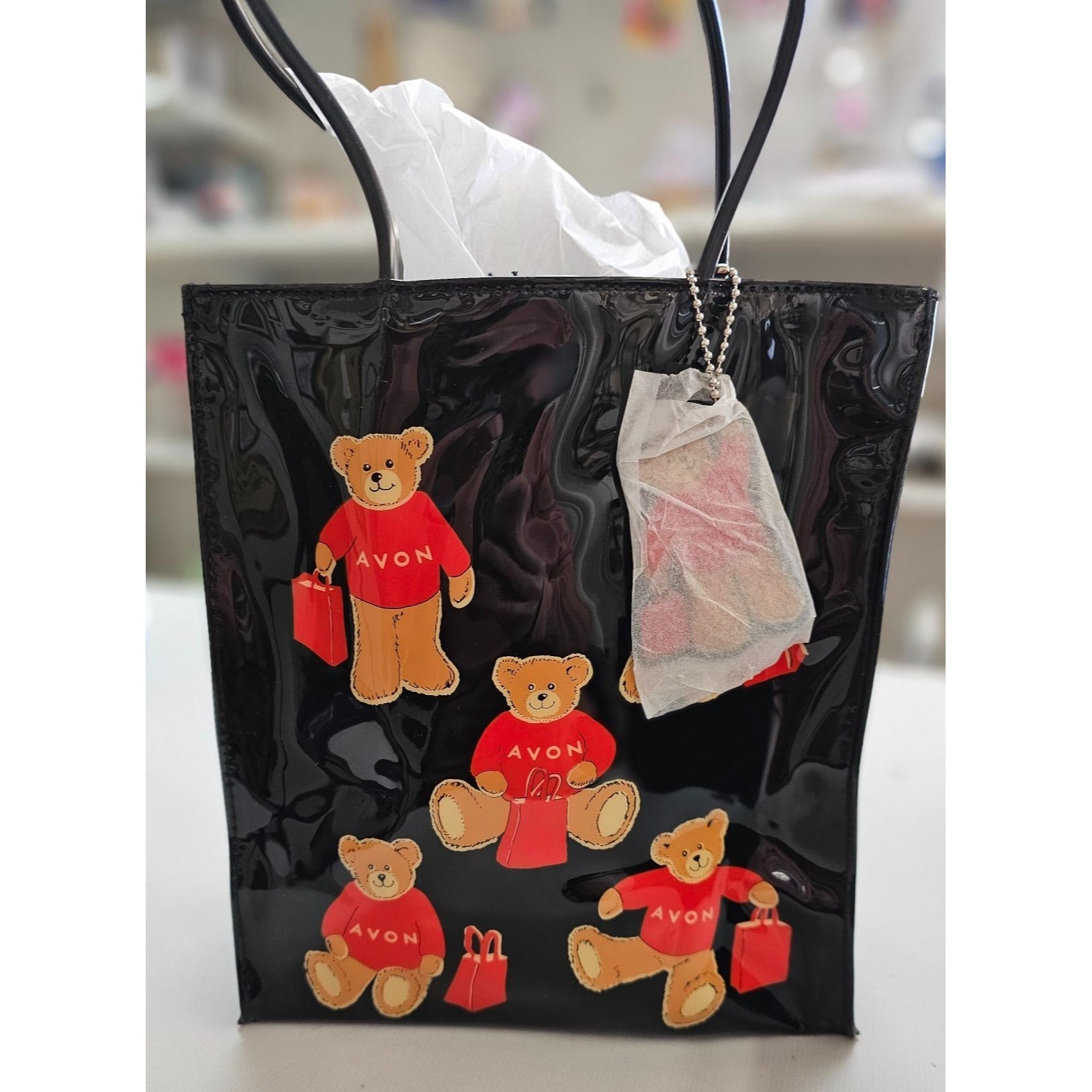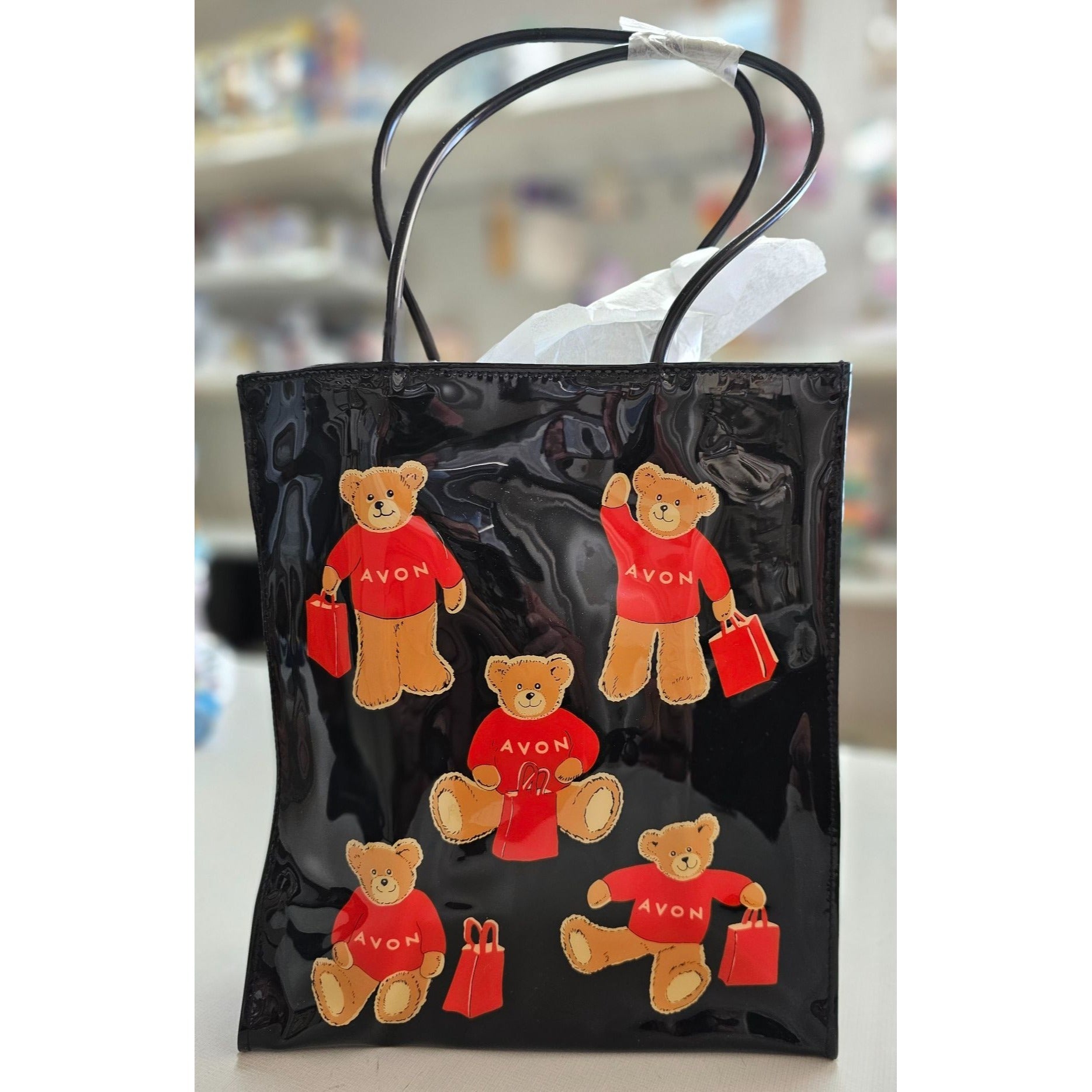 A charming and stylish tote with a glossy black finish featuring adorable Avon teddy bear designs. Lightweight with a matching bear keychain, this bag is both practical and delightfully fun. Ideal for adding a playful touch to your accessories.