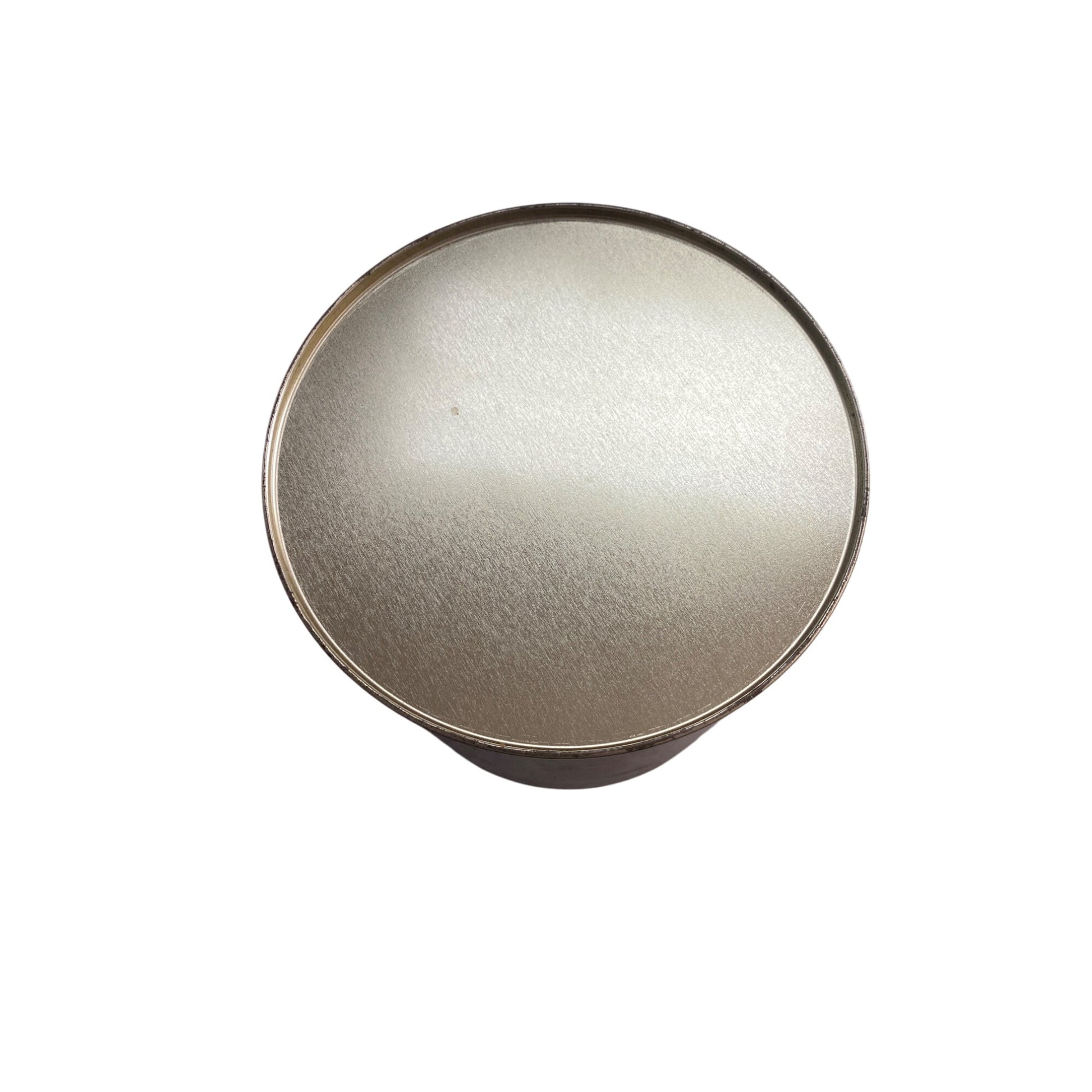 Visible rust spots and scratches on the lid and edges. Diameter approximately 5 inches, height approximately 6 inches.