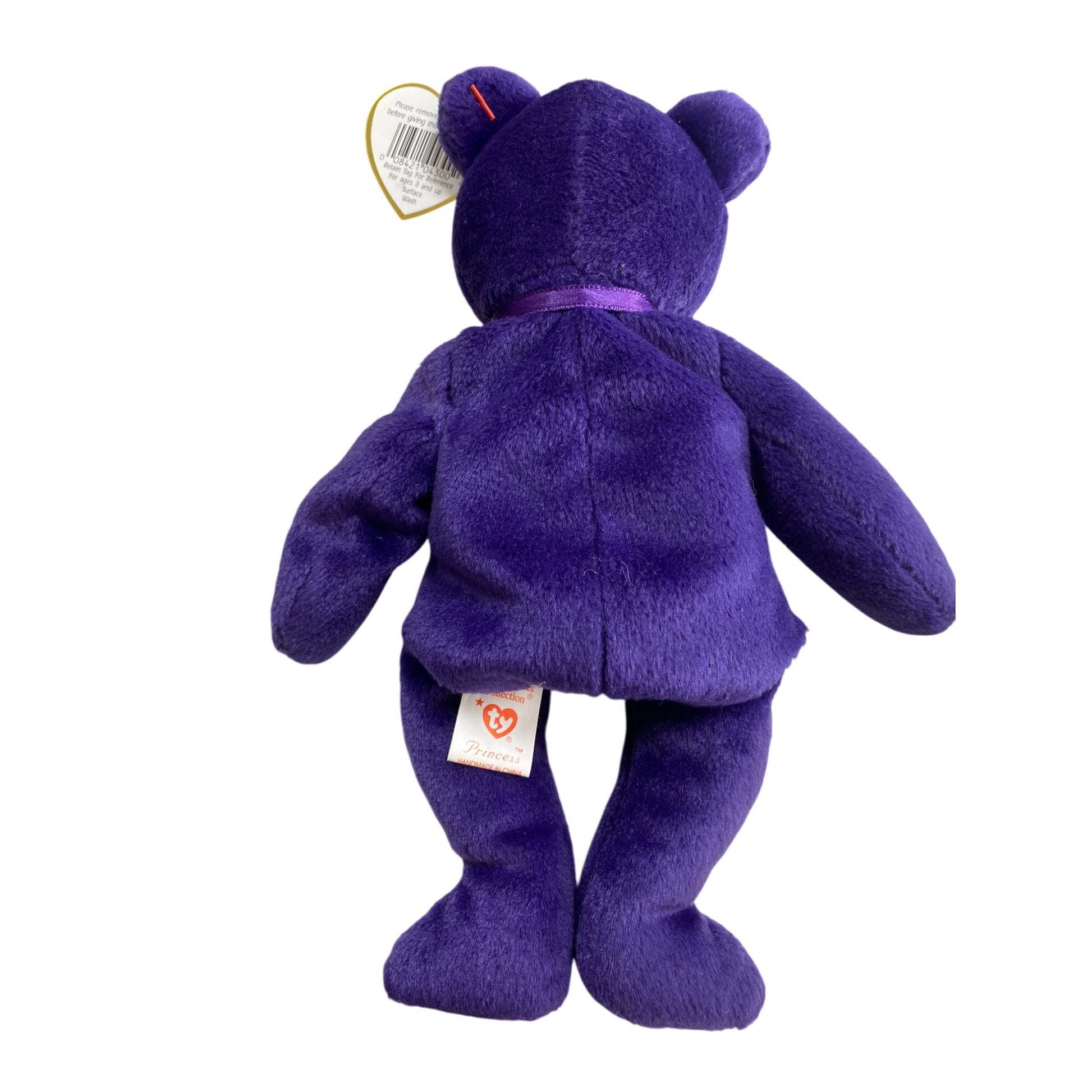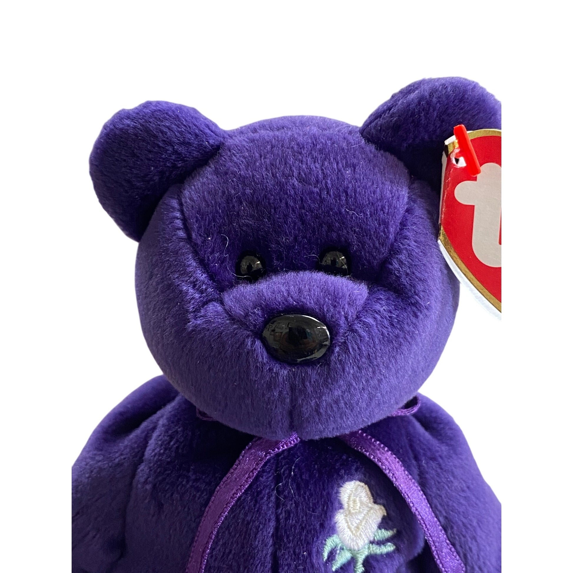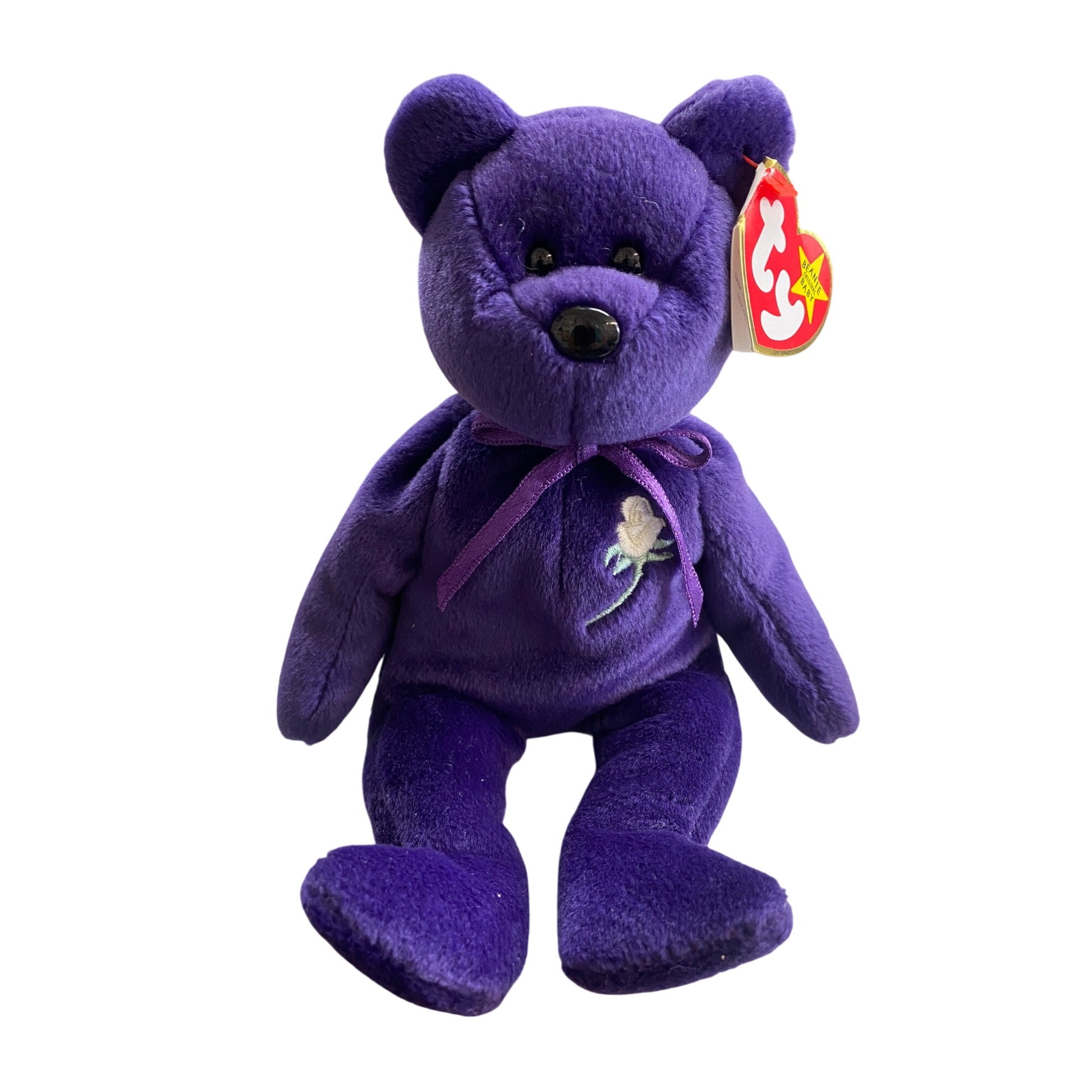 This Princess Diana Beanie Baby is a cherished collectible, crafted with plush polyester fiber. Its deep purple hue and floral embroidery add elegance, making it a timeless keepsake for any collection.