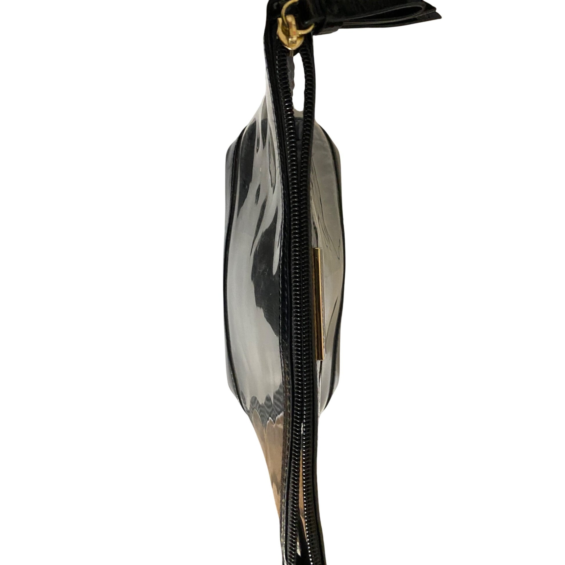 Enhance your travel experience with this stylish and practical makeup bag. Its clear design allows for easy visibility of your cosmetics, while the black patent leather trim adds a touch of sophistication. Experience the blend of functionality and fashion, making it an essential accessory for organized and chic journeys.