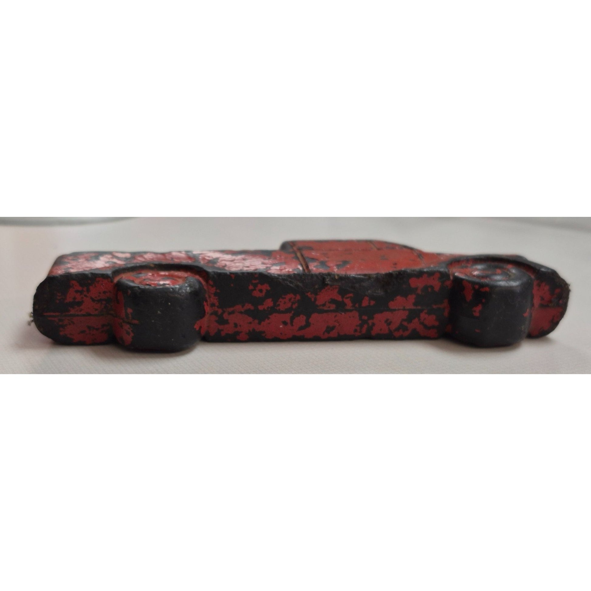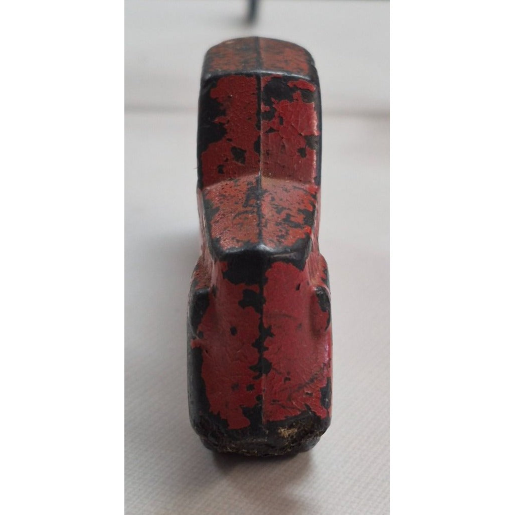 Step back in time with this authentic 1946 Judy's Farm toy truck, a charming piece of mid-century Americana. Crafted from flat hard rubber and painted in classic red with black accents, this vintage truck carries the marks of play and history—chipped paint, worn edges, and all the character you'd expect from a well-loved toy nearly 80 years old.