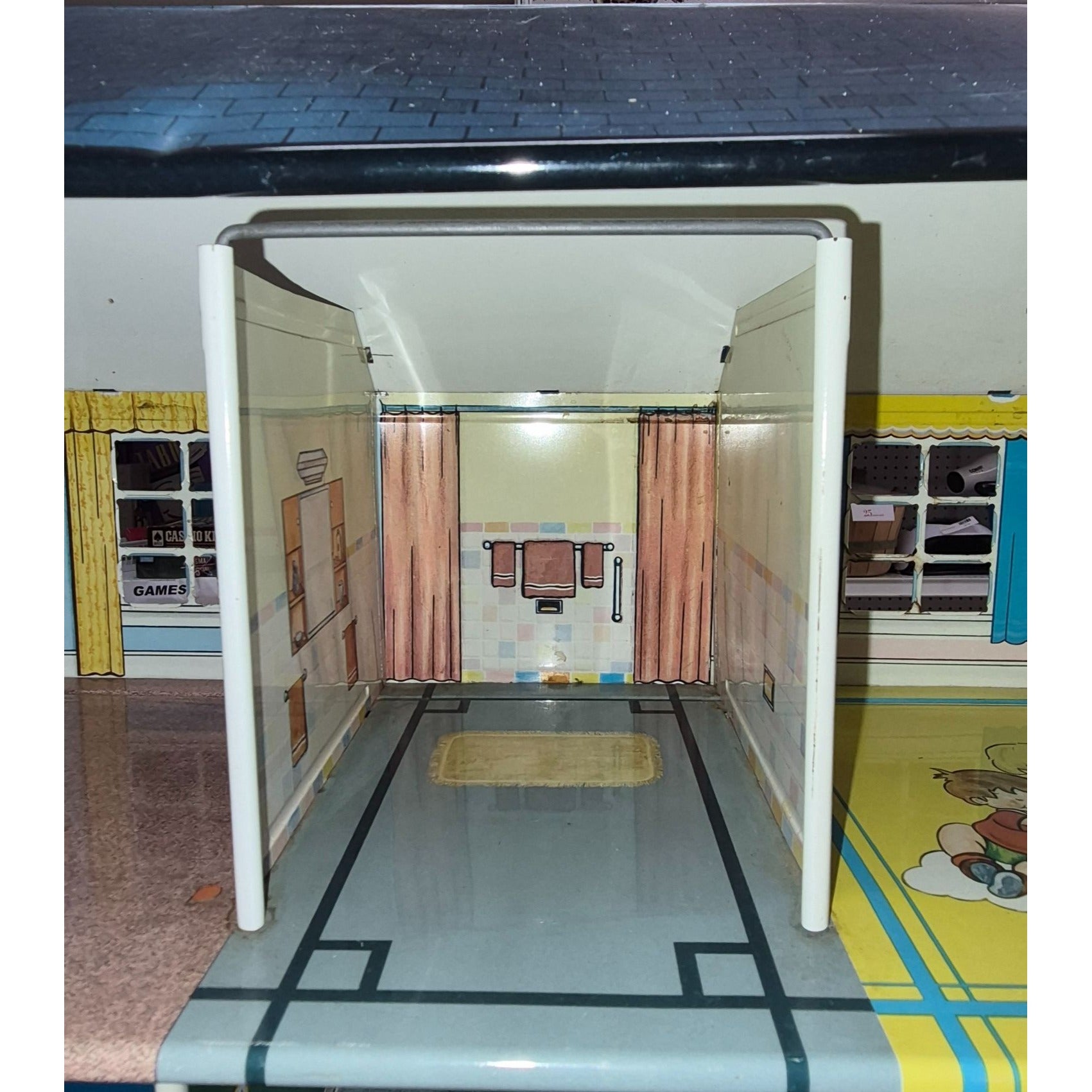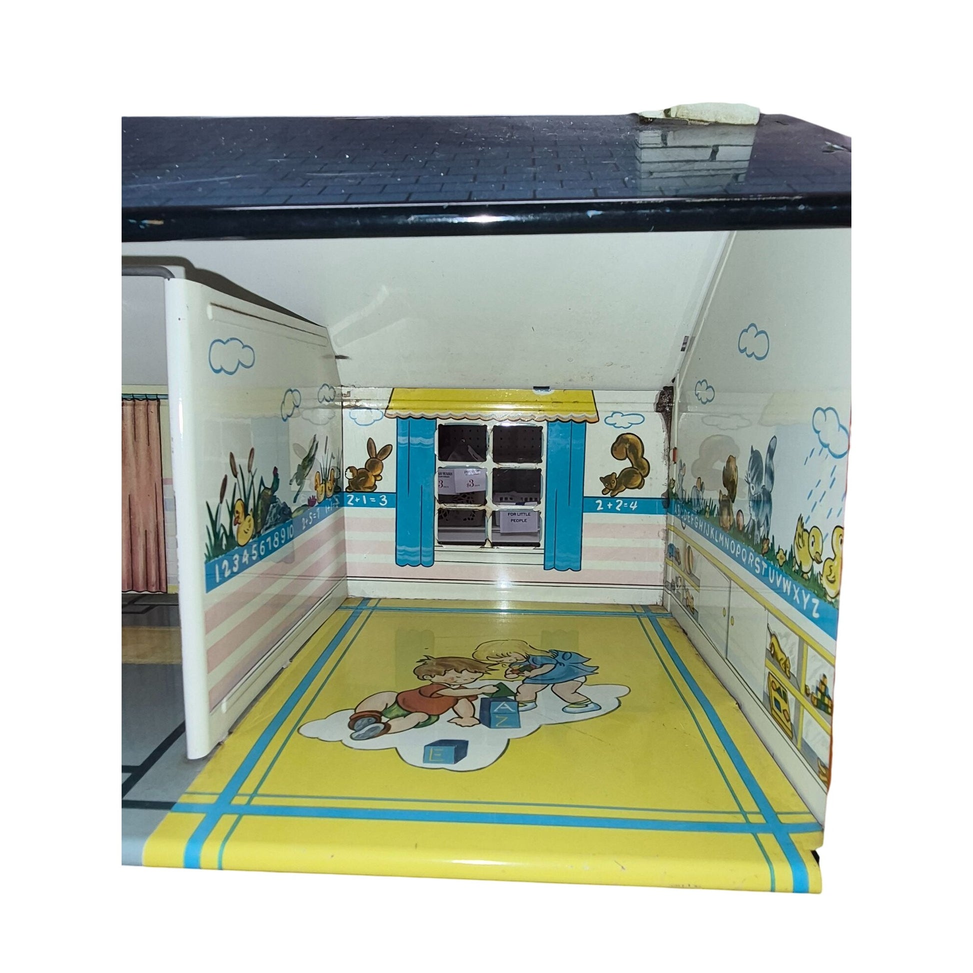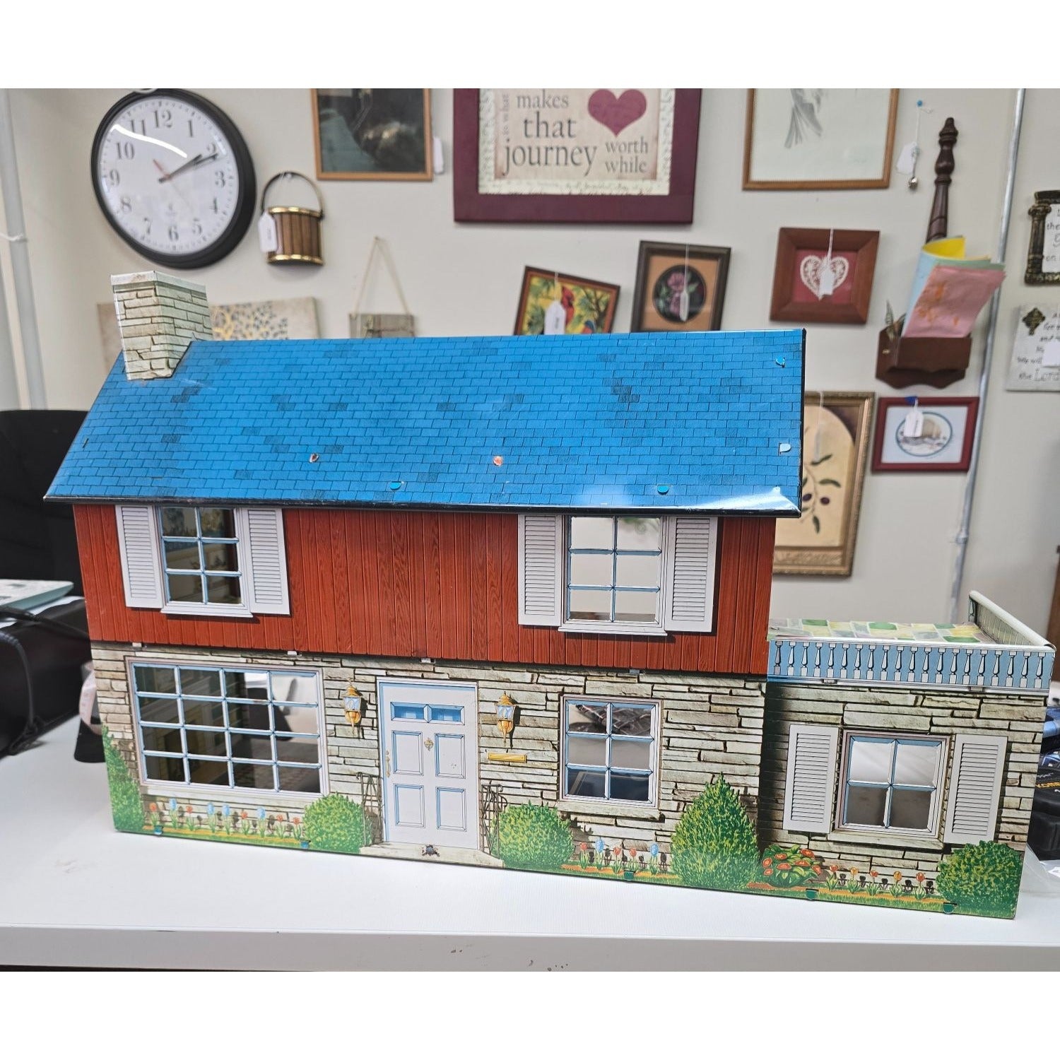 Own a piece of history with this delightful 1950s Marx litho tin dollhouse. Its charming design, with intricate details and a spacious patio, provides hours of imaginative play. A wonderful addition to any vintage toy collection, this dollhouse offers a glimpse into a bygone era of craftsmanship and design.