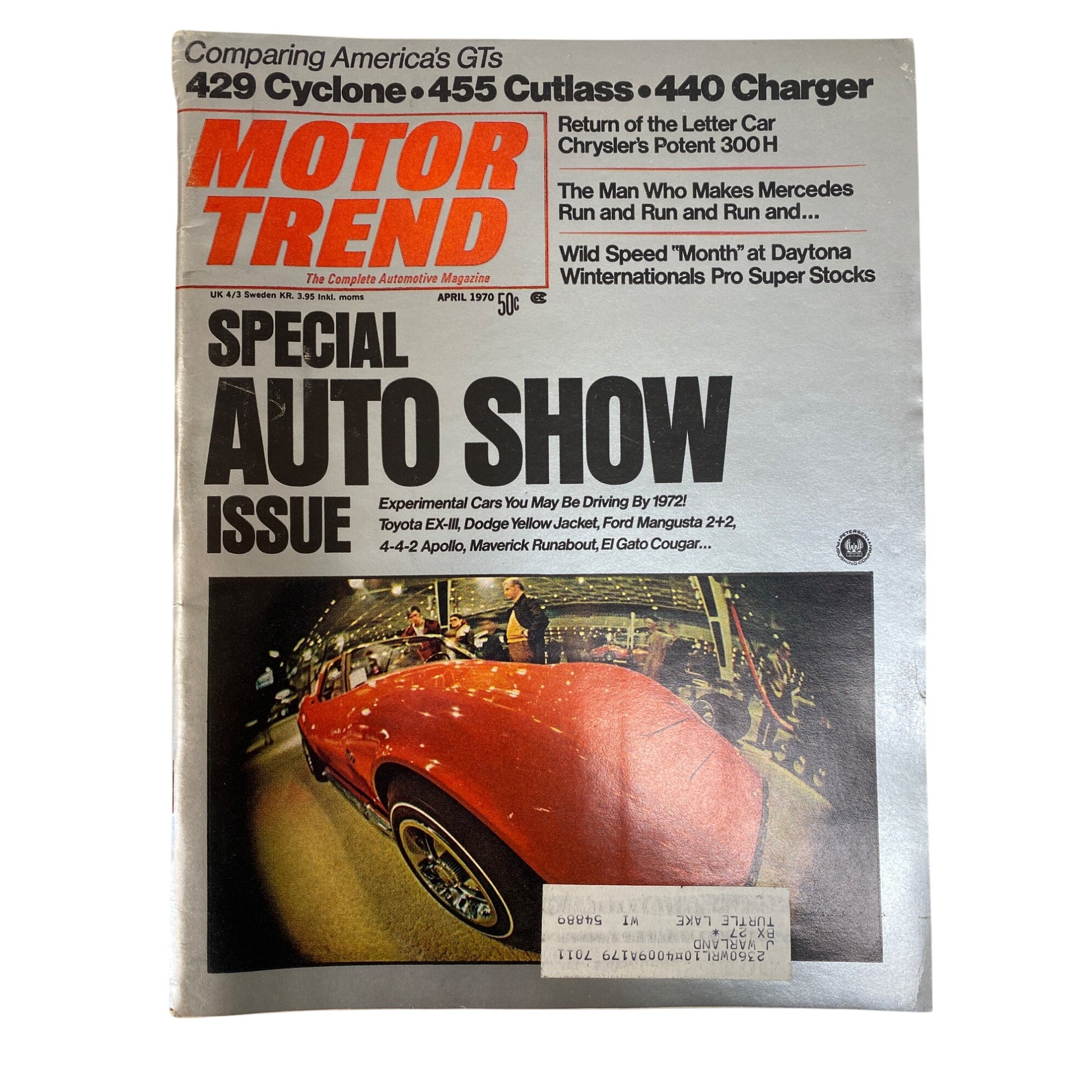 This classic April 1970 Motor Trend magazine offers a nostalgic glimpse into automotive history with a special auto show issue and iconic Marlboro ad.