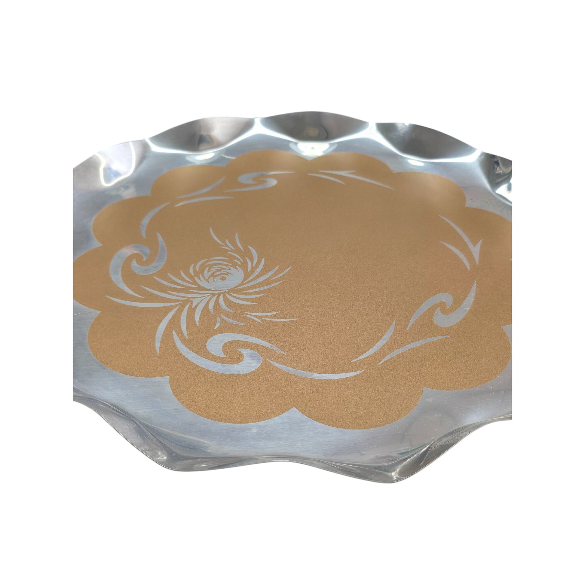 Enhance your table setting with this vintage aluminum serving tray. Its embossed floral design adds elegance to any occasion. Durable and timeless, this tray is ideal for serving appetizers, desserts, or drinks. Its unique scalloped edge and intricate detailing offer both functionality and style, making it a standout piece for entertaining.