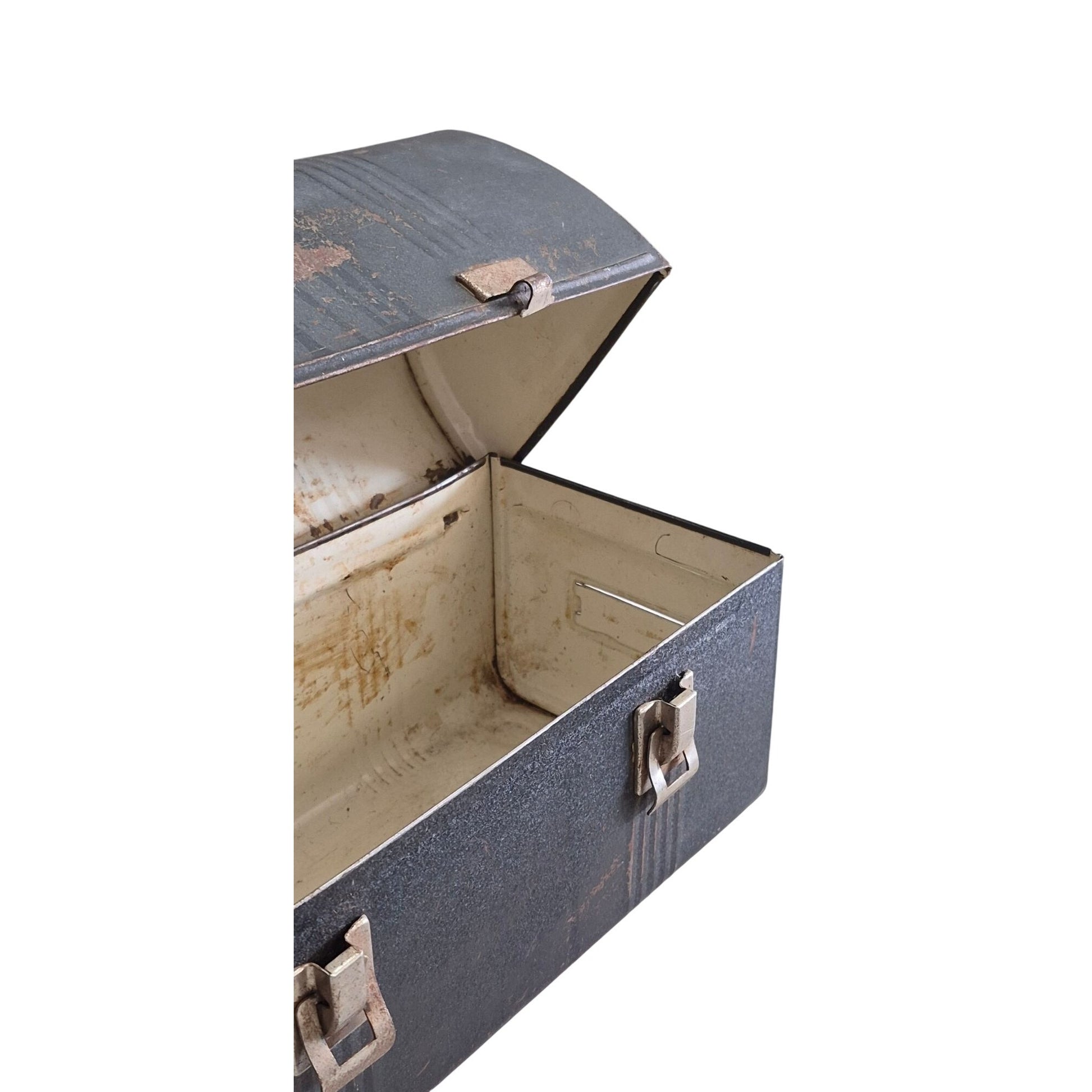 Rust, dents, and scratches present throughout, adding character to the vintage piece. Approximate measurements, 10" x 8" x 4"