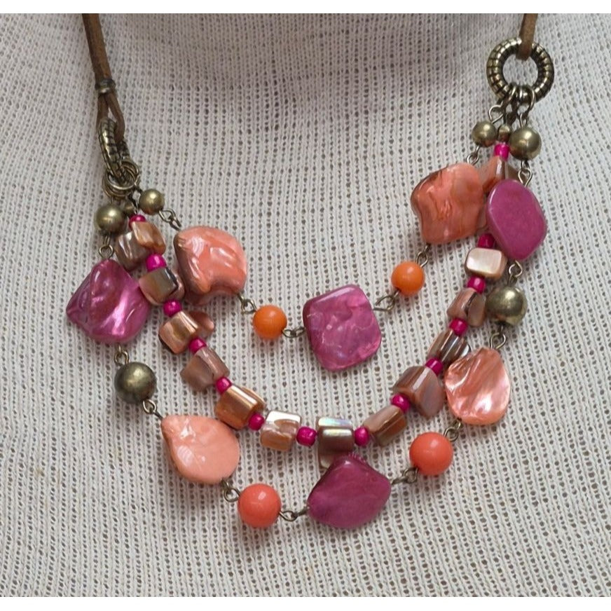 A vibrant, multi‑strand beaded necklace with an eclectic mix of colors and textures. Features large pearlescent beads in pink, peach, and purple, paired with orange rounds, tiny magenta spacers, and metallic gold and silver tube beads. Antique‑brass connectors and accents give it a warm, vintage look.