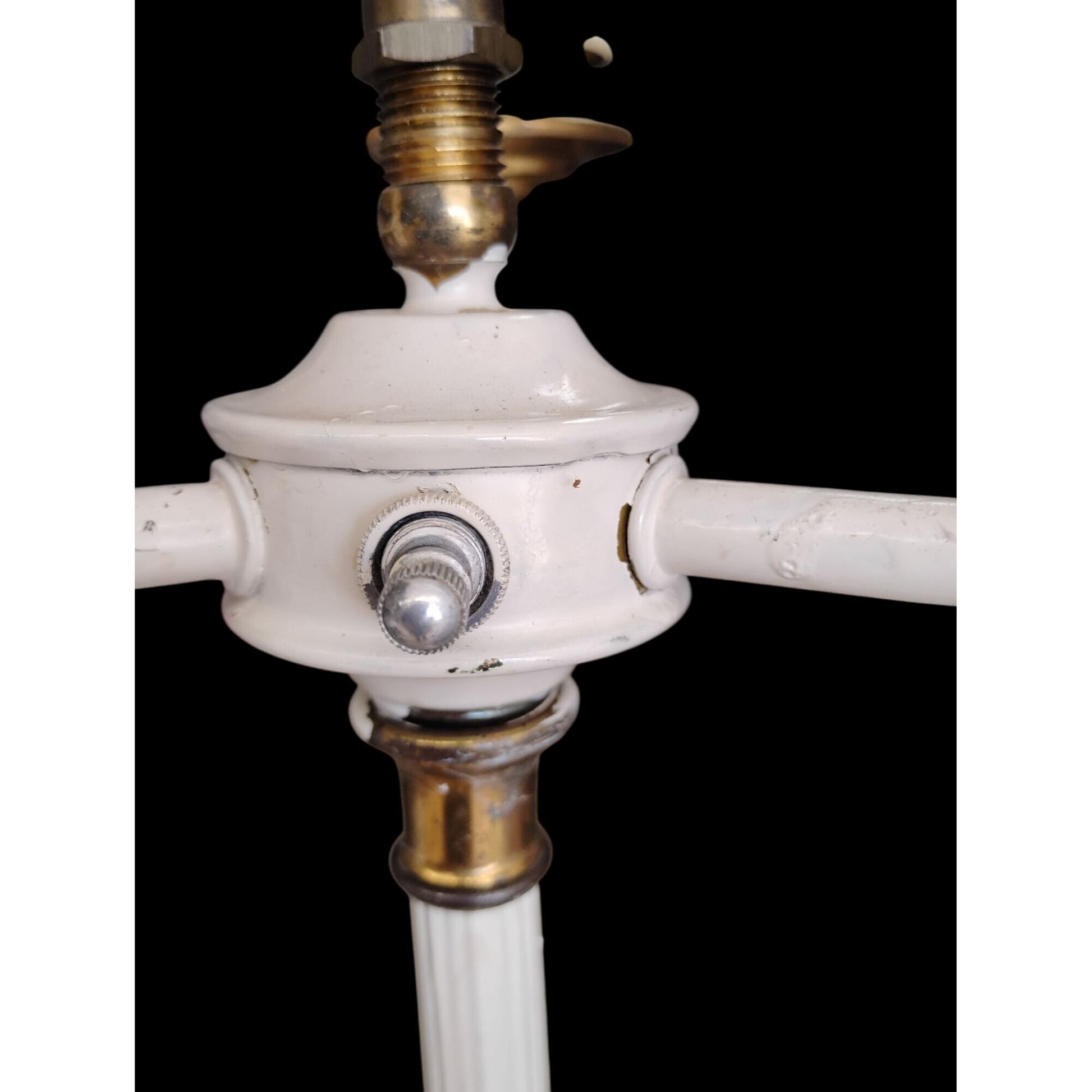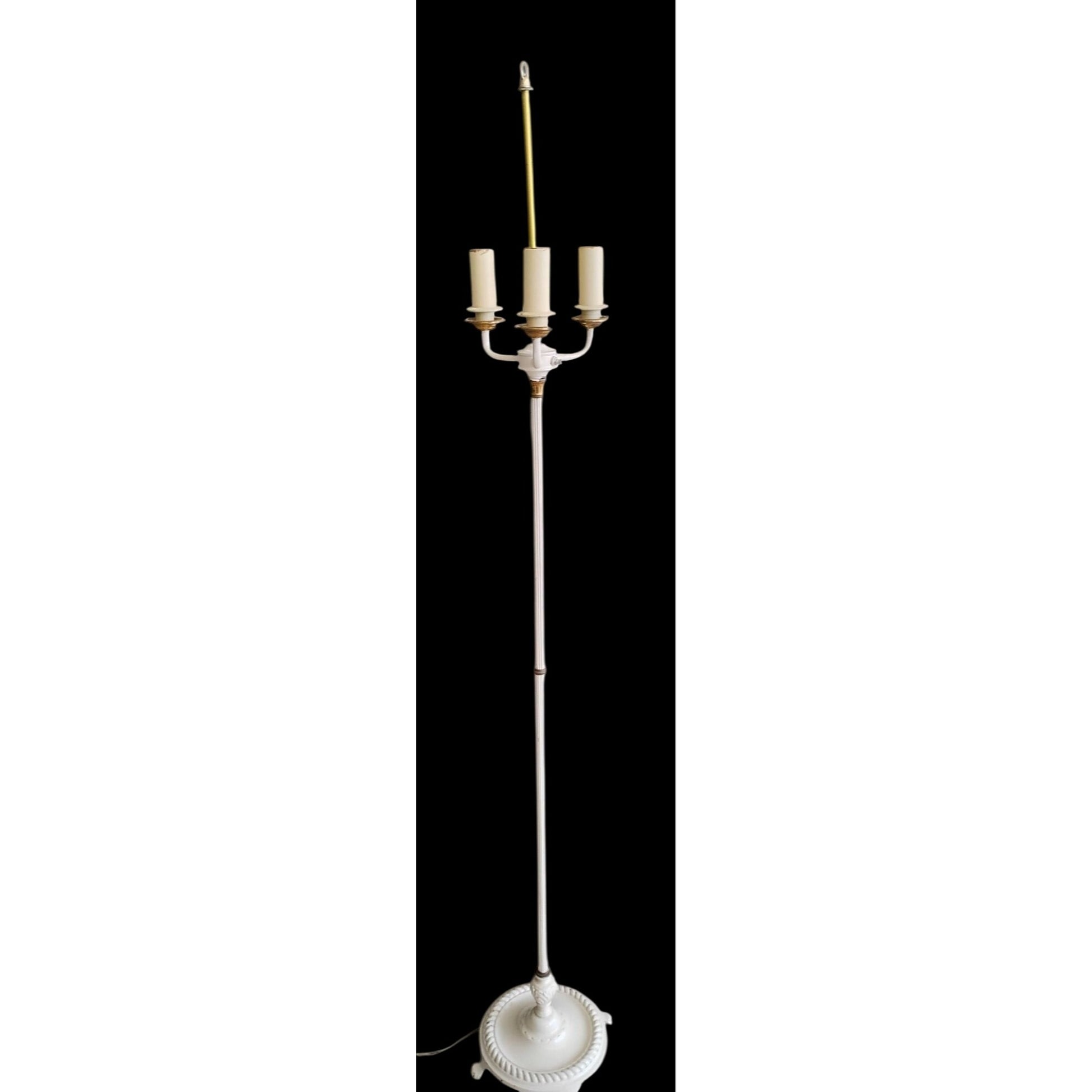 A stunning vintage torchiere floor lamp with three candelabra arms. Perfect for adding a classic touch to any room, this cast iron piece stands at 63 inches tall.