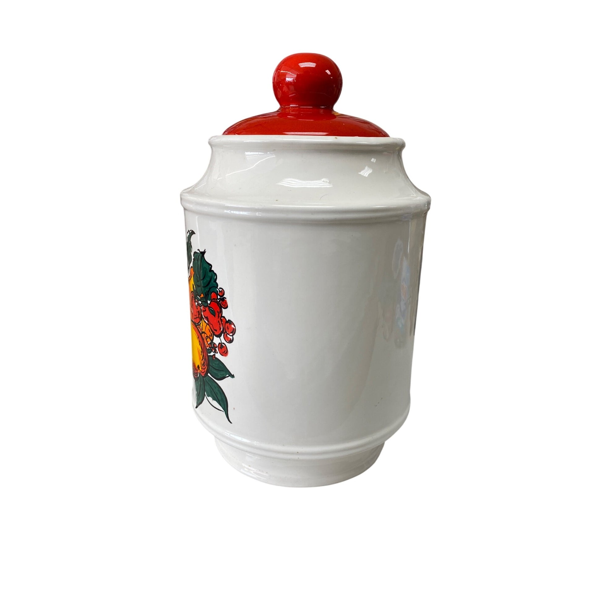 Vintage Ceramic Kitchen Cookie Jar With Bright Red Lid & Fruit Design