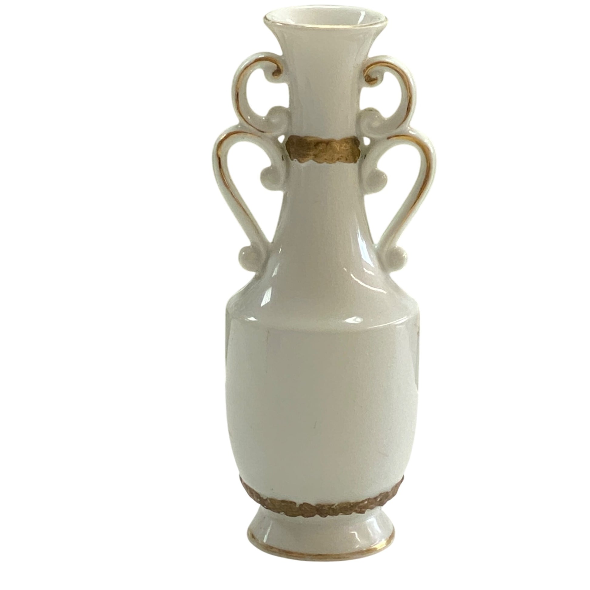 This vintage ceramic vase features dual handles and a raised relief design, perfect for adding a touch of elegance to any room or collection. Ideal for flower arrangements or as a standalone decorative piece.