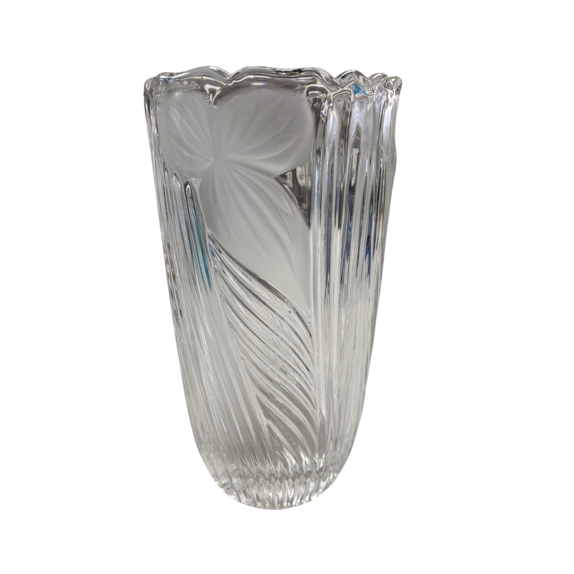This elegant vintage vase enhances home decor with its intricate frosted floral design and swirl pattern. Ideal for floral arrangements or standalone display.