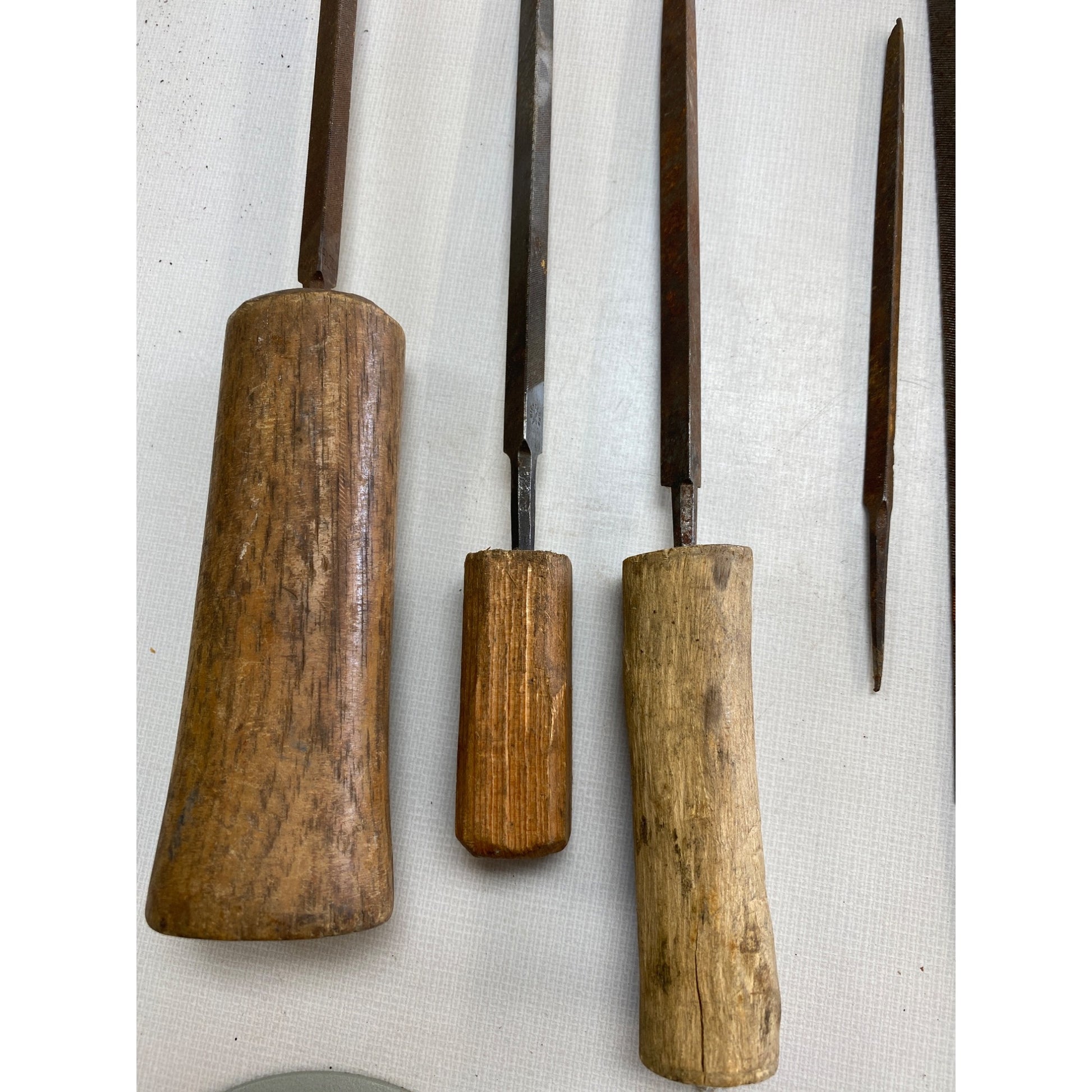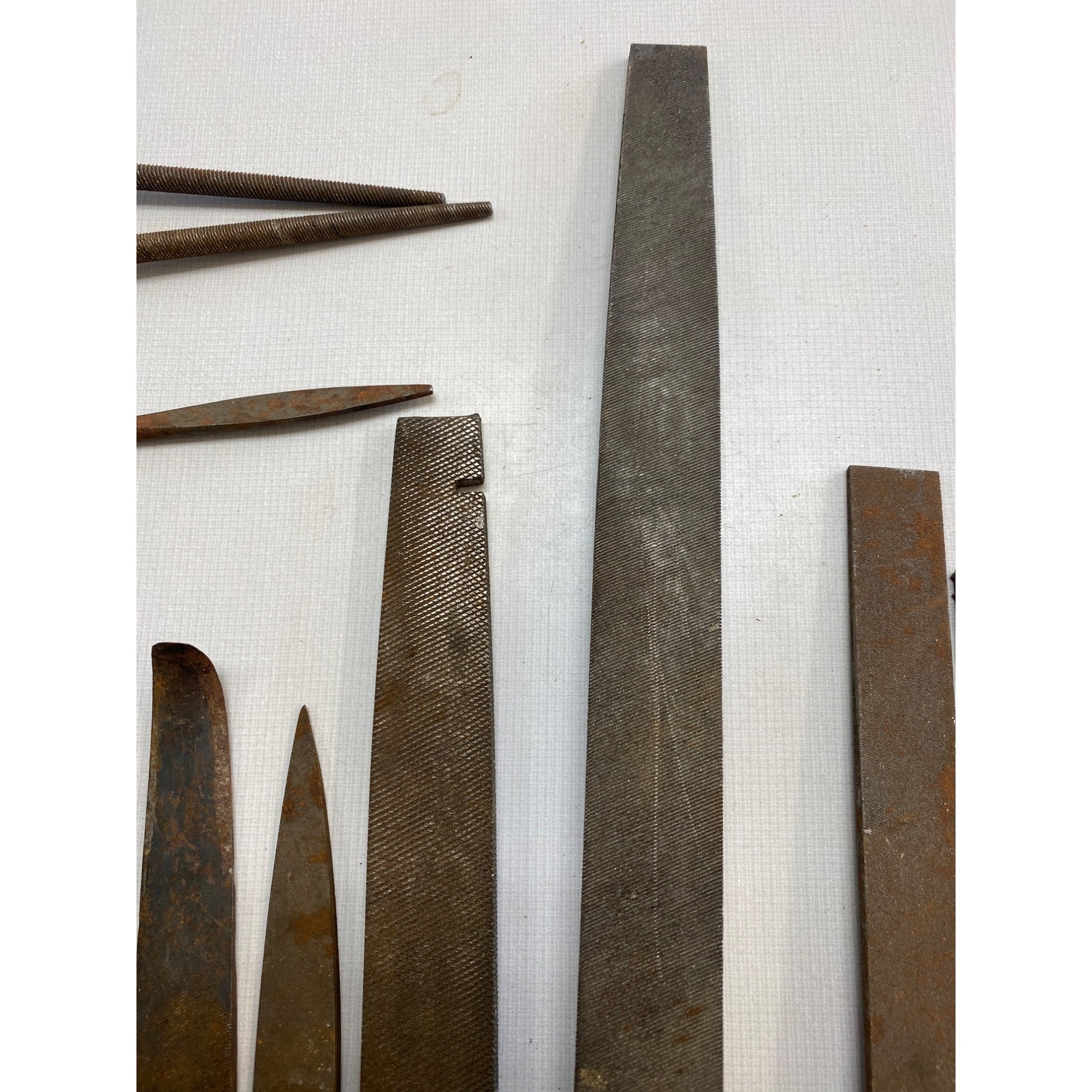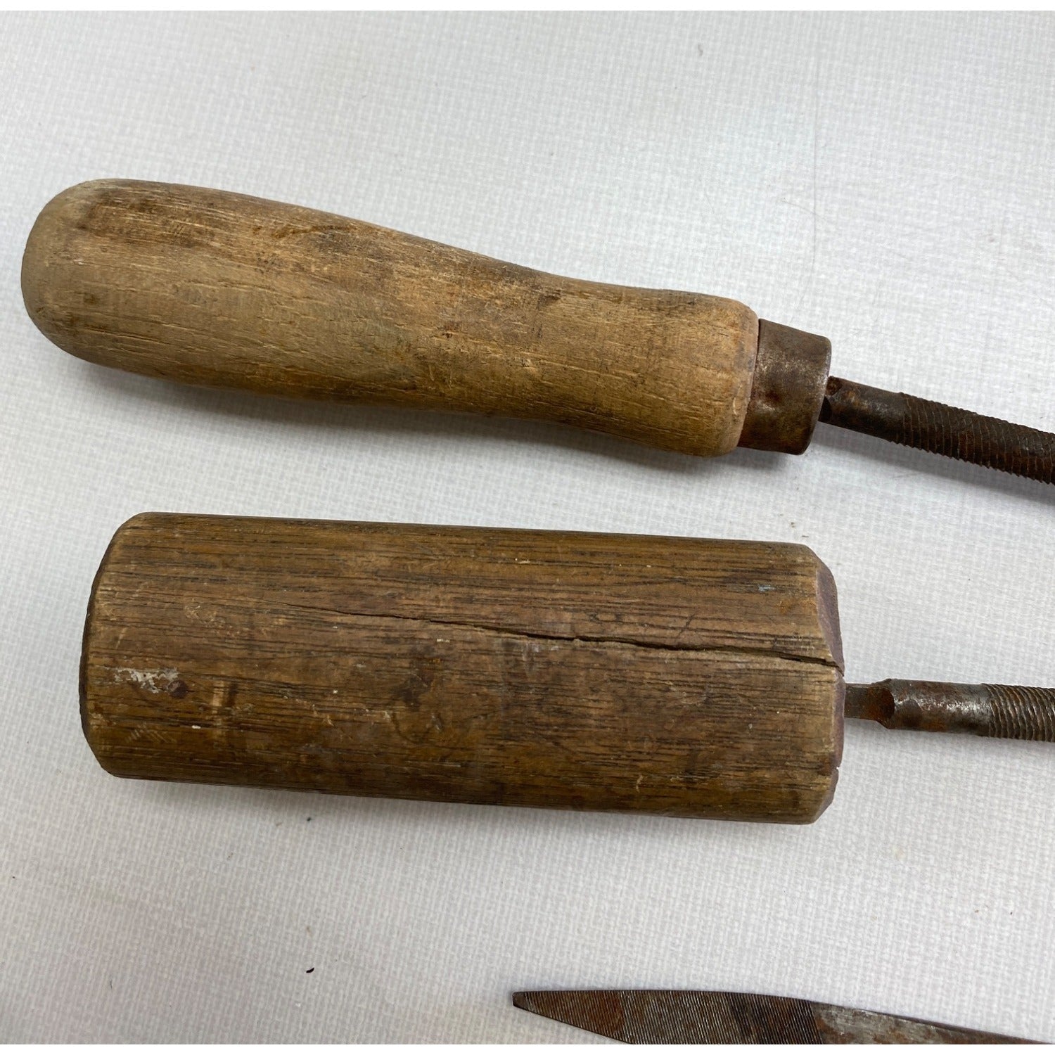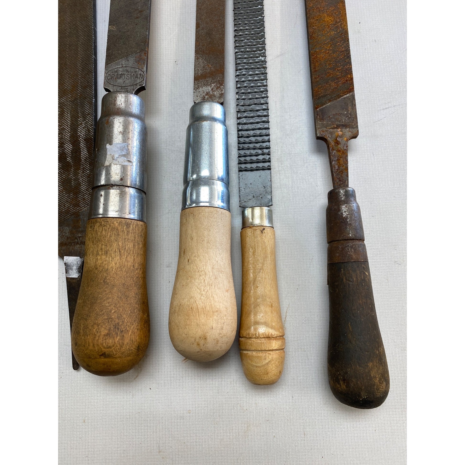 This collection of vintage files offers robust utility for any craftsman. Their diverse shapes and sizes cater to a range of metalworking and woodworking needs. The distinctive wooden handles provide comfort and control, enhancing your crafting precision. Embrace the character and craftsmanship of these reliable tools in your workshop.