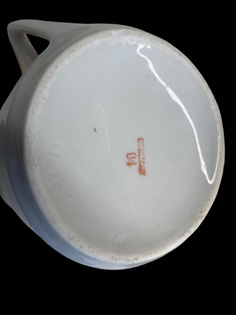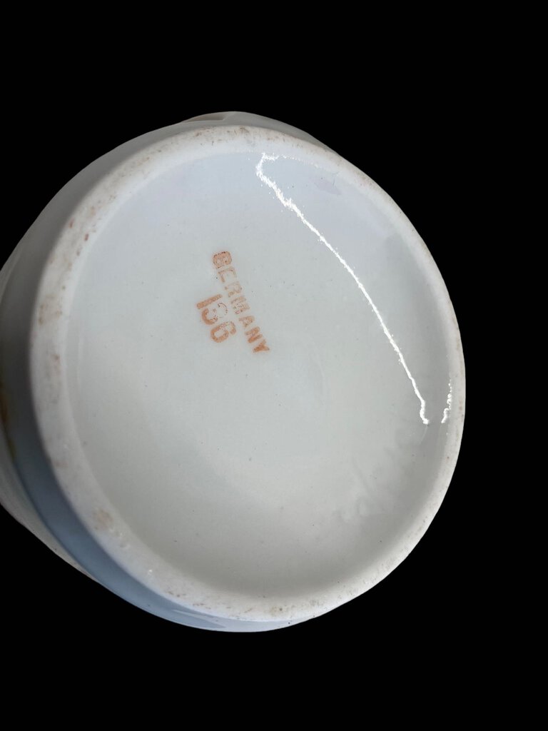 Elegant porcelain cream and sugar bowl set adorned with delicate yellow roses, crafted in Germany. Perfect for tea parties or as a charming display piece.