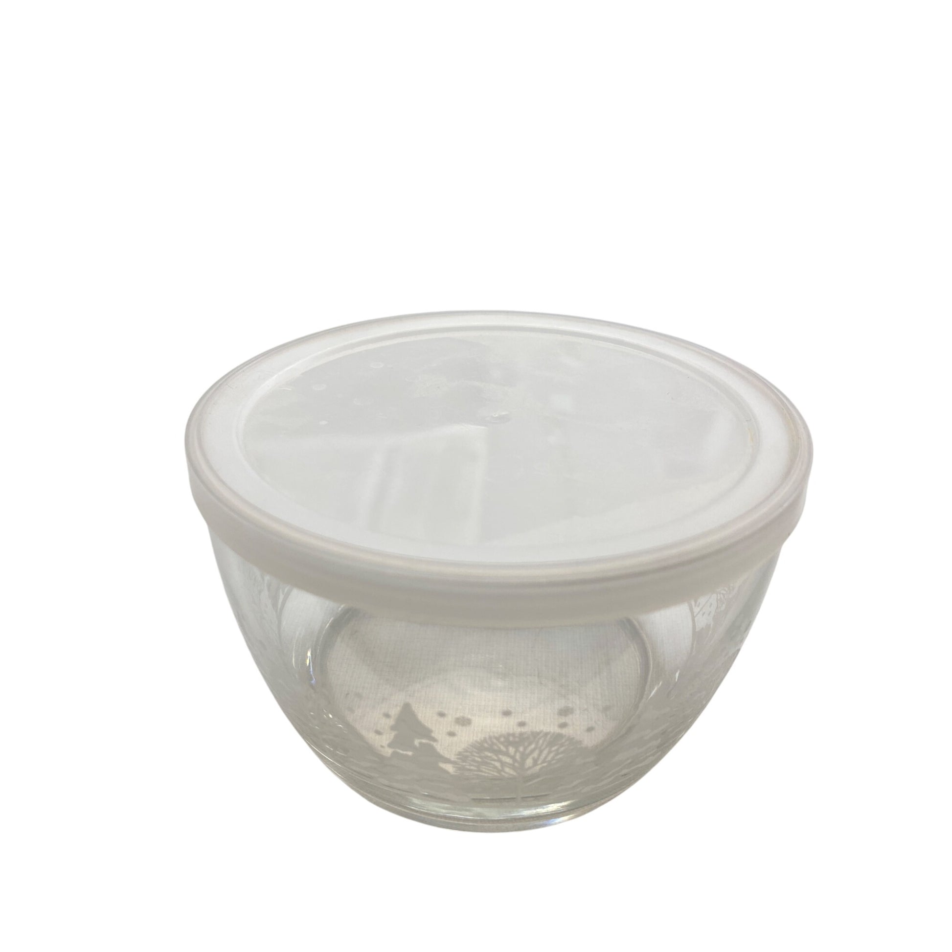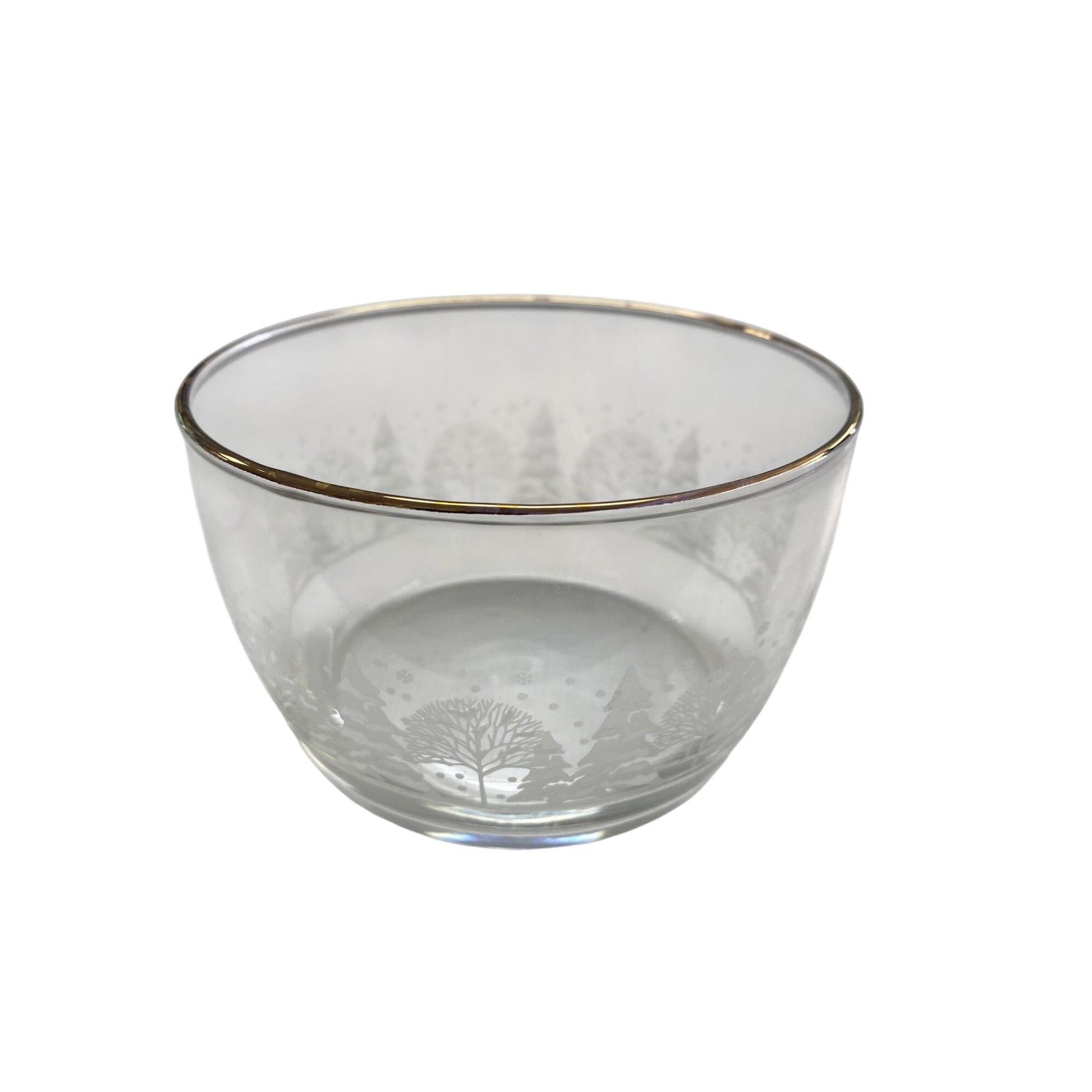 Add elegant charm to your kitchen or table with this vintage glass bowl. The winter scene etching and gold rim make it both decorative and practical.