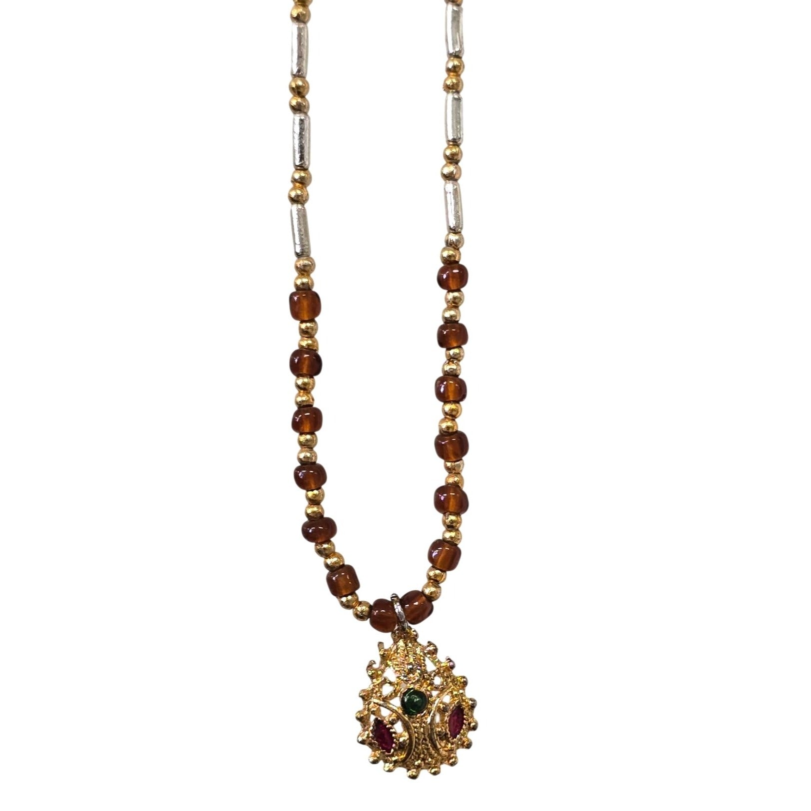 A vintage gold‑tone statement necklace featuring an ornate filigree pendant set with a green center cabochon and two red accent cabochons. The pendant hangs from a strand of alternating brown and gold beads, finished with a classic screw‑barrel clasp typical of mid‑century costume jewelry.