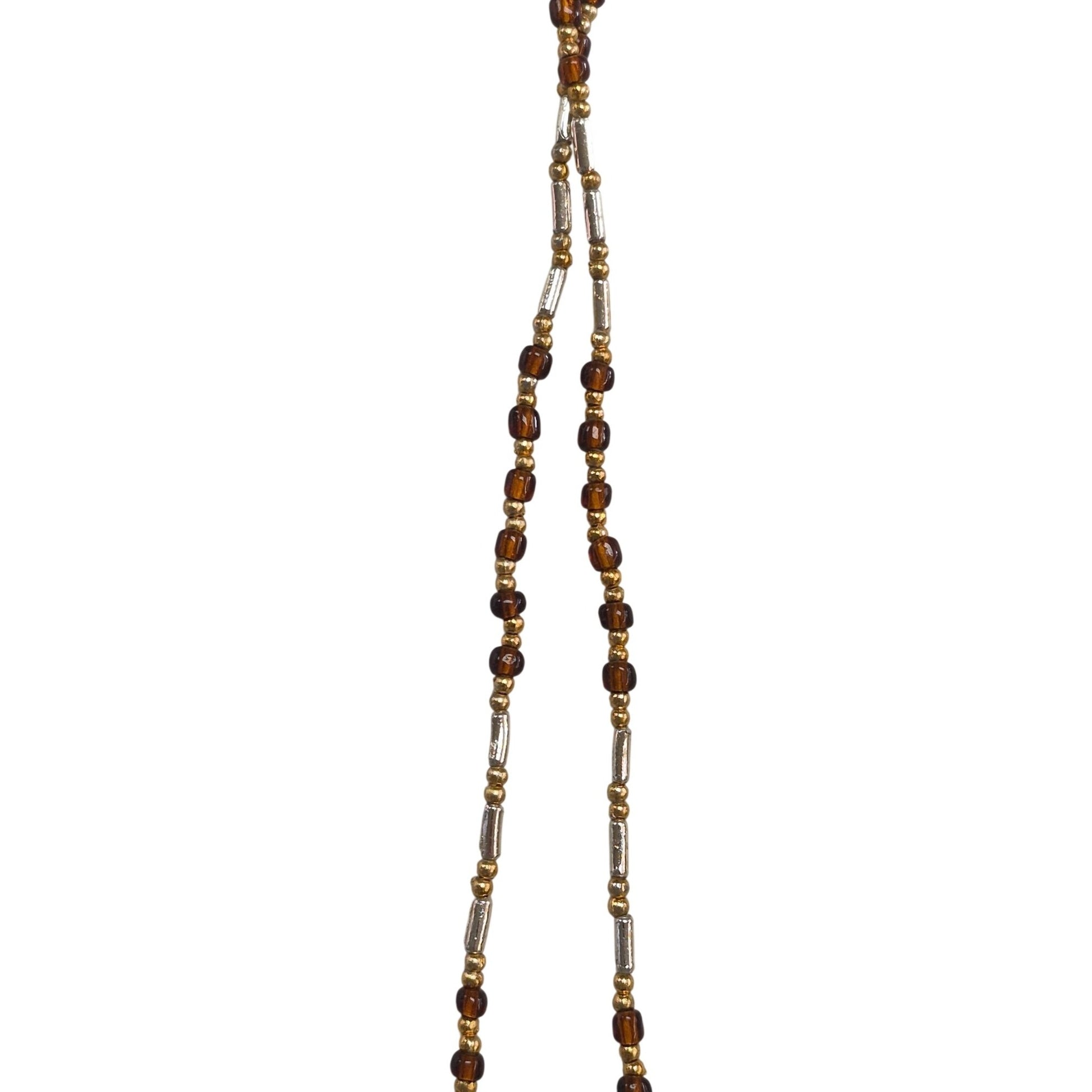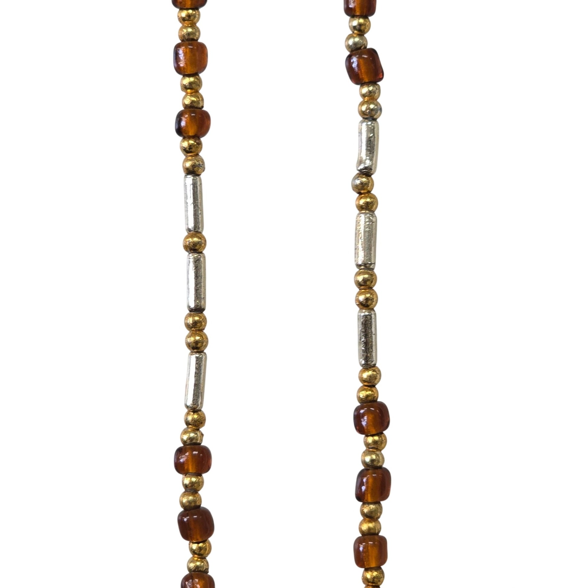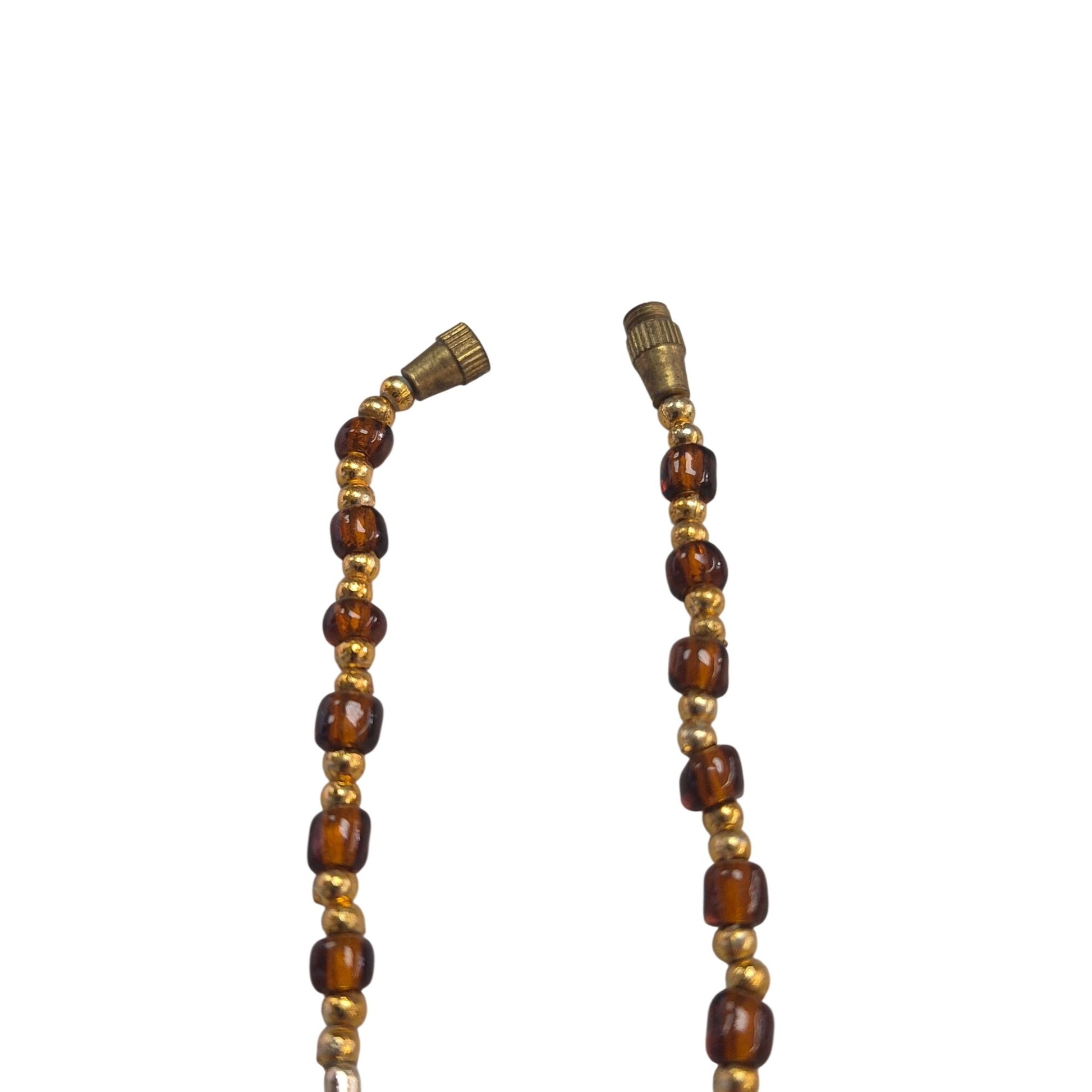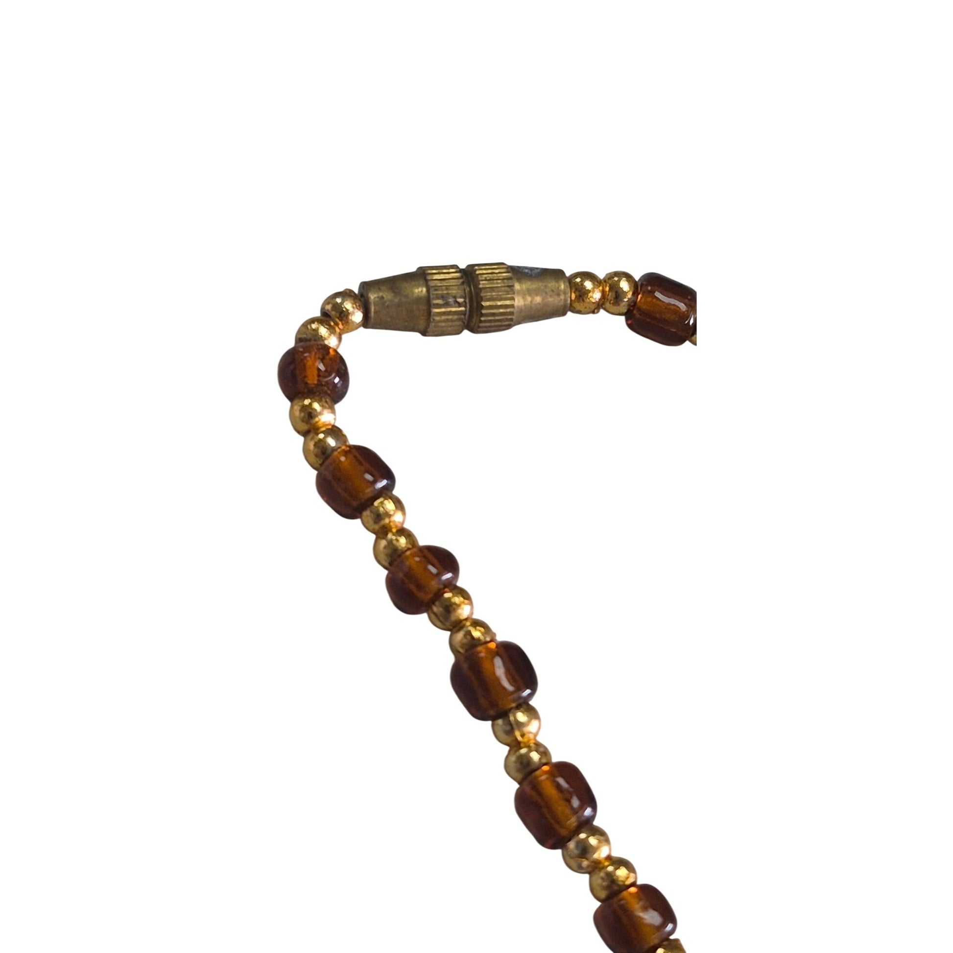 This piece reflects the 1960s–70s “ethnic revival” style, blending bold color with decorative metalwork. The materials are costume‑grade—glass cabochons, gold‑tone metal, and mixed beads—making it a striking accessory with a warm, boho feel.