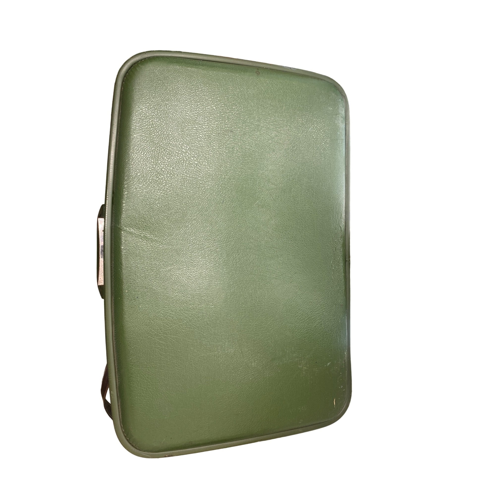 **This vintage suitcase combines classic design with practical functionality. Its spacious interior and durable exterior make it an ideal choice for travelers seeking style and reliability. The suitcase's unique green color stands out, promising easy identification. Durable construction ensures longevity, while the beige lining adds a touch of elegance.
