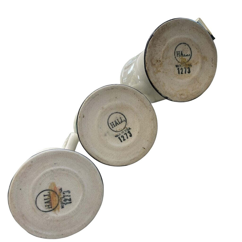 These vintage Hall USA 1273 mugs blend timeless design with functionality. Their footed black bases create a striking contrast to the white body, adding elegance to your tableware collection.