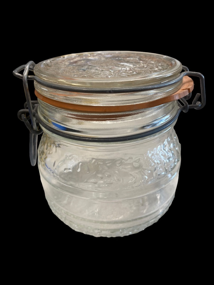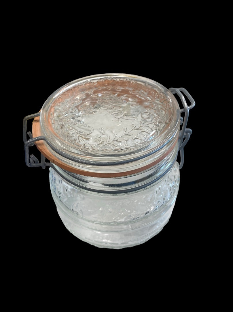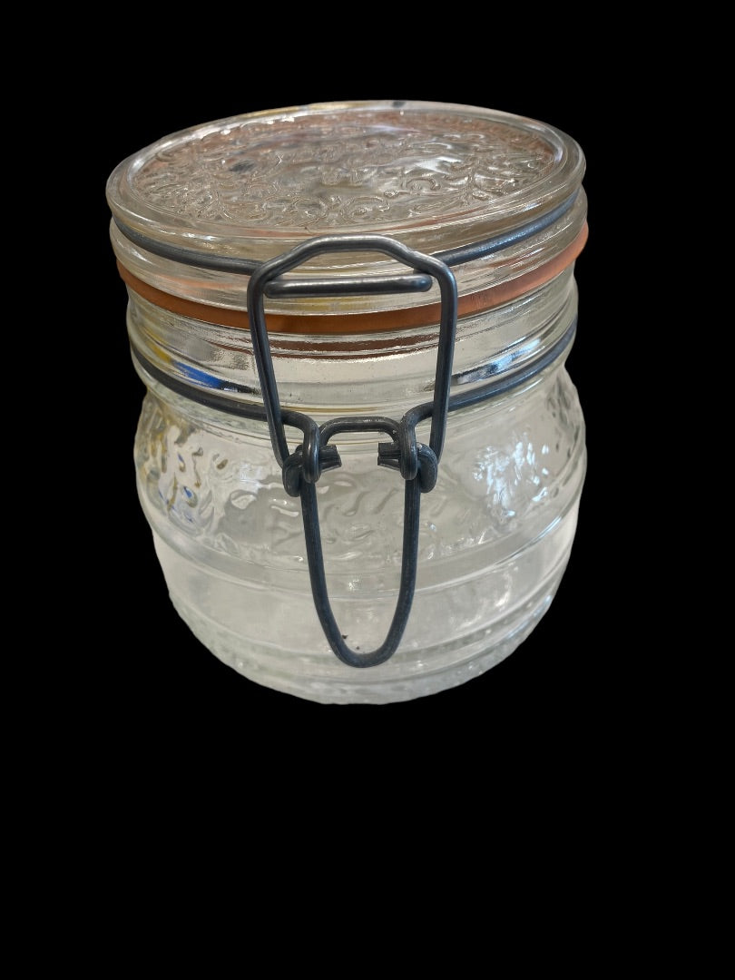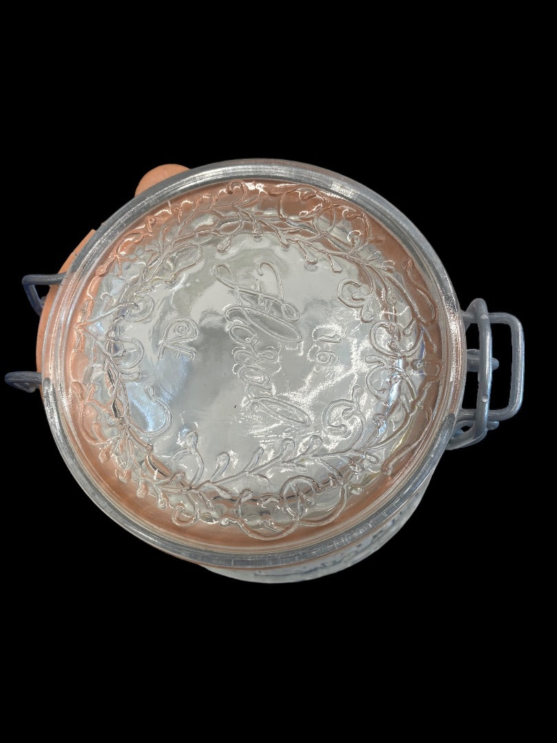 VINTAGE Italian Floral Cove Glass Metal Handle Jar with Rubber Seal