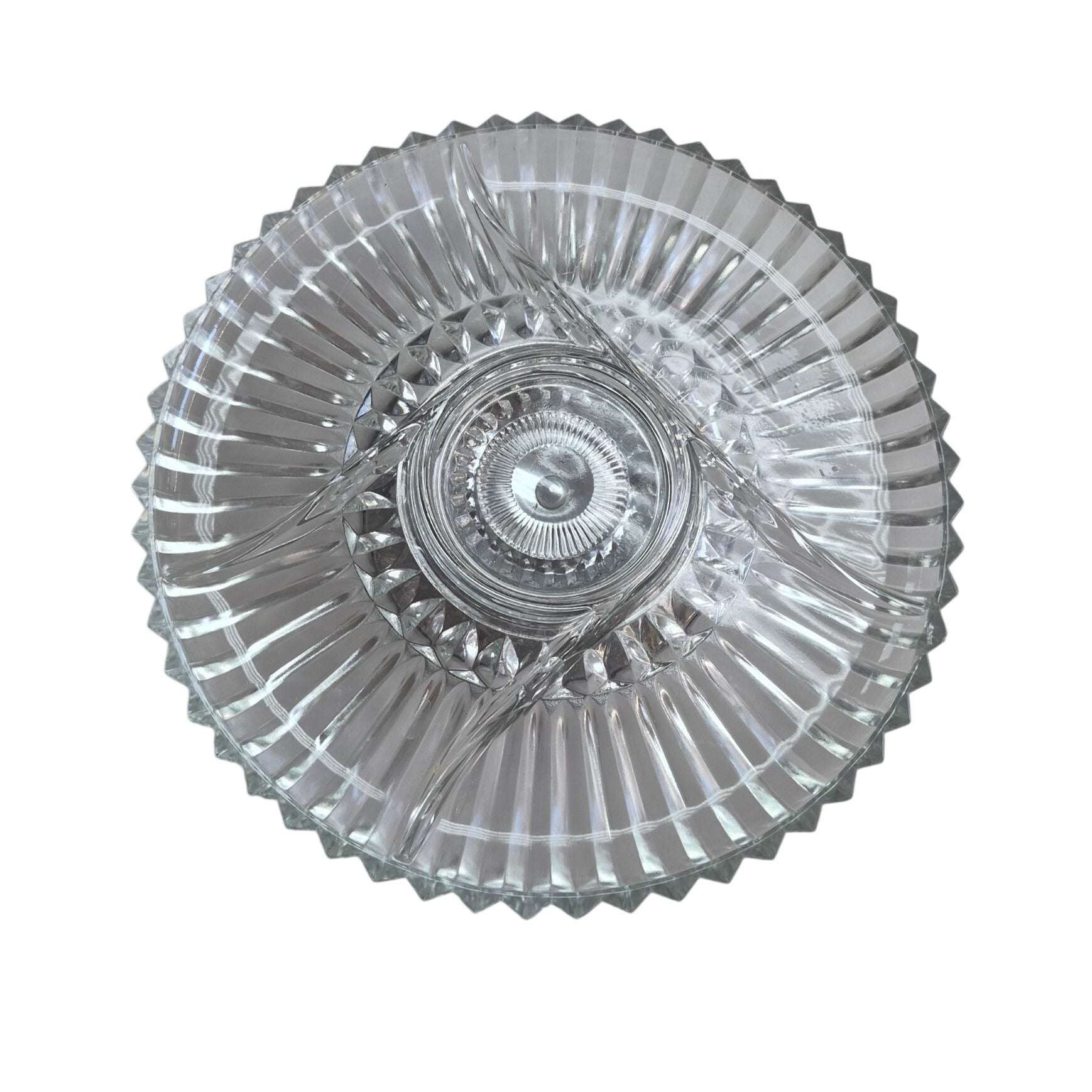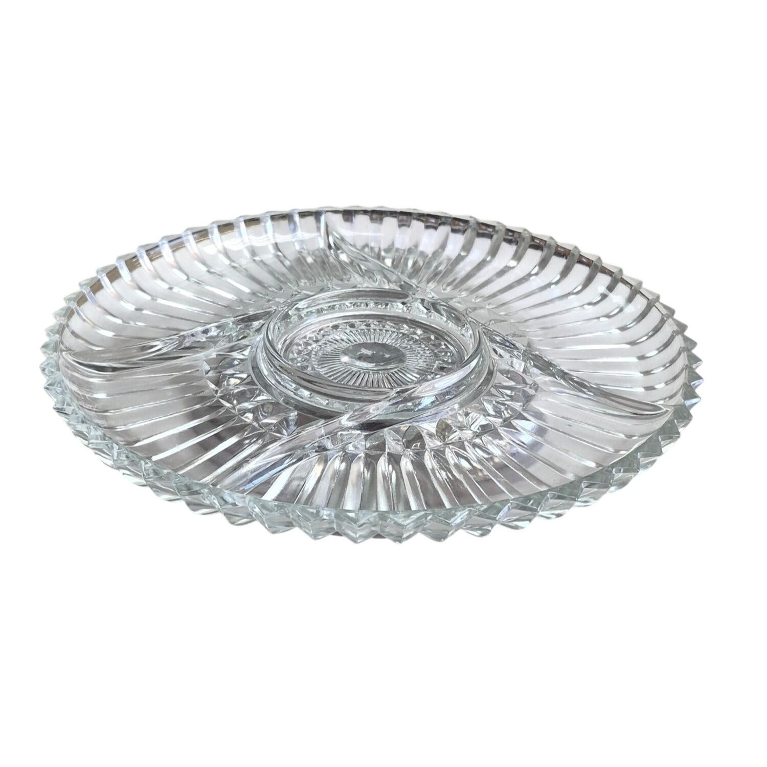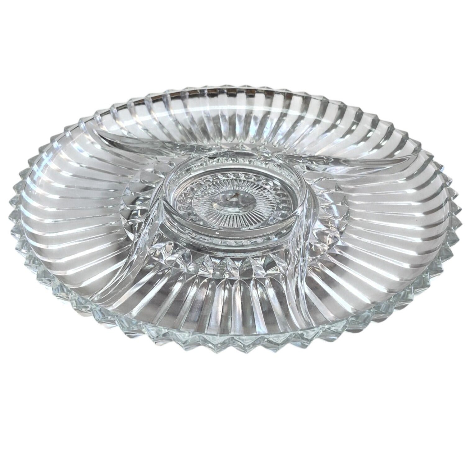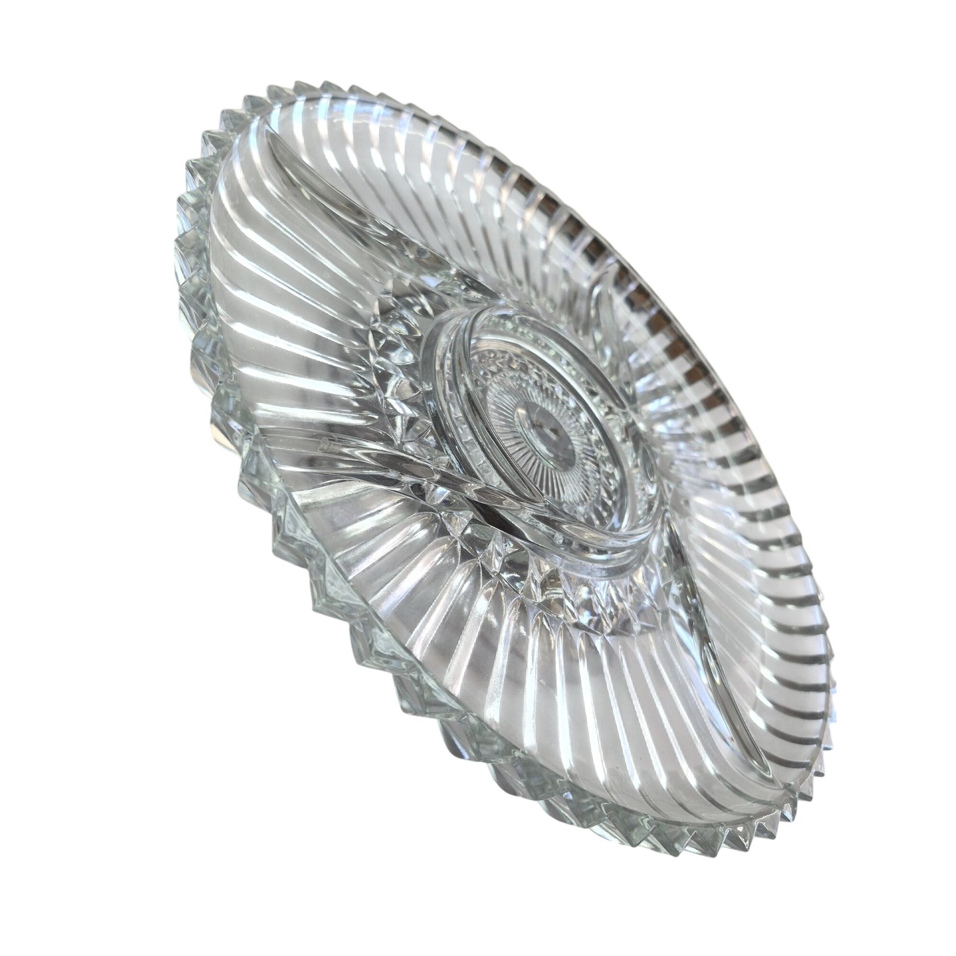 Enhance your dining experience with this elegant vintage crystal serving tray. Its divided sections and sturdy metal base make it practical and visually stunning.