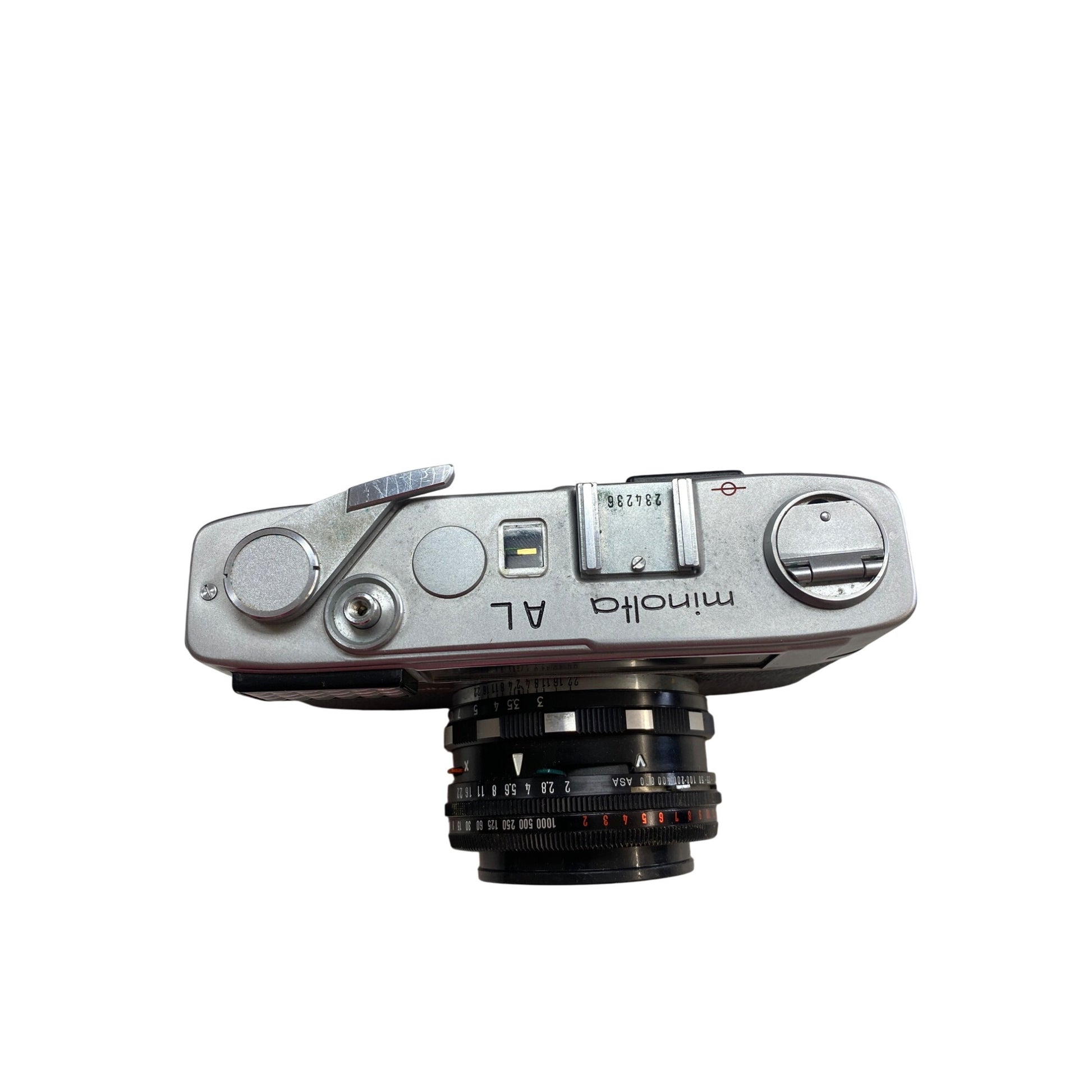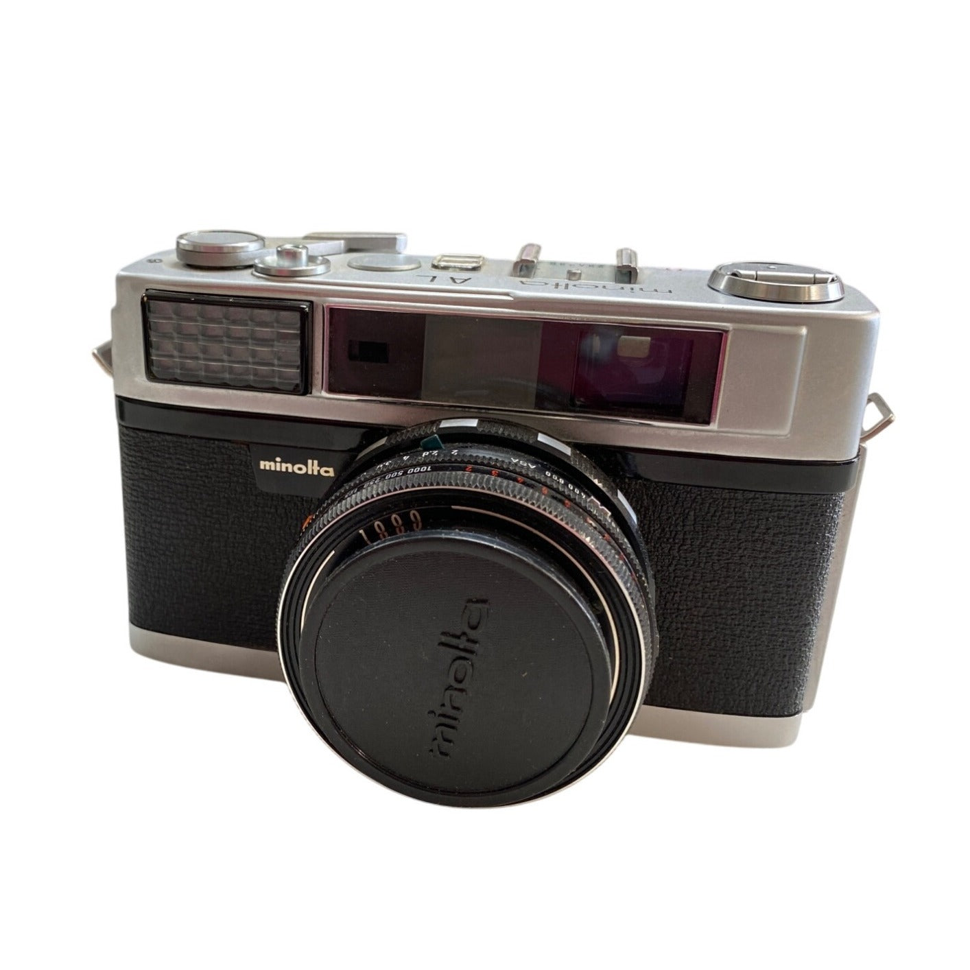 Capture timeless memories with this vintage Minolta AL 35mm film camera. Its durable leather case and classic design make it a collector's treasure.