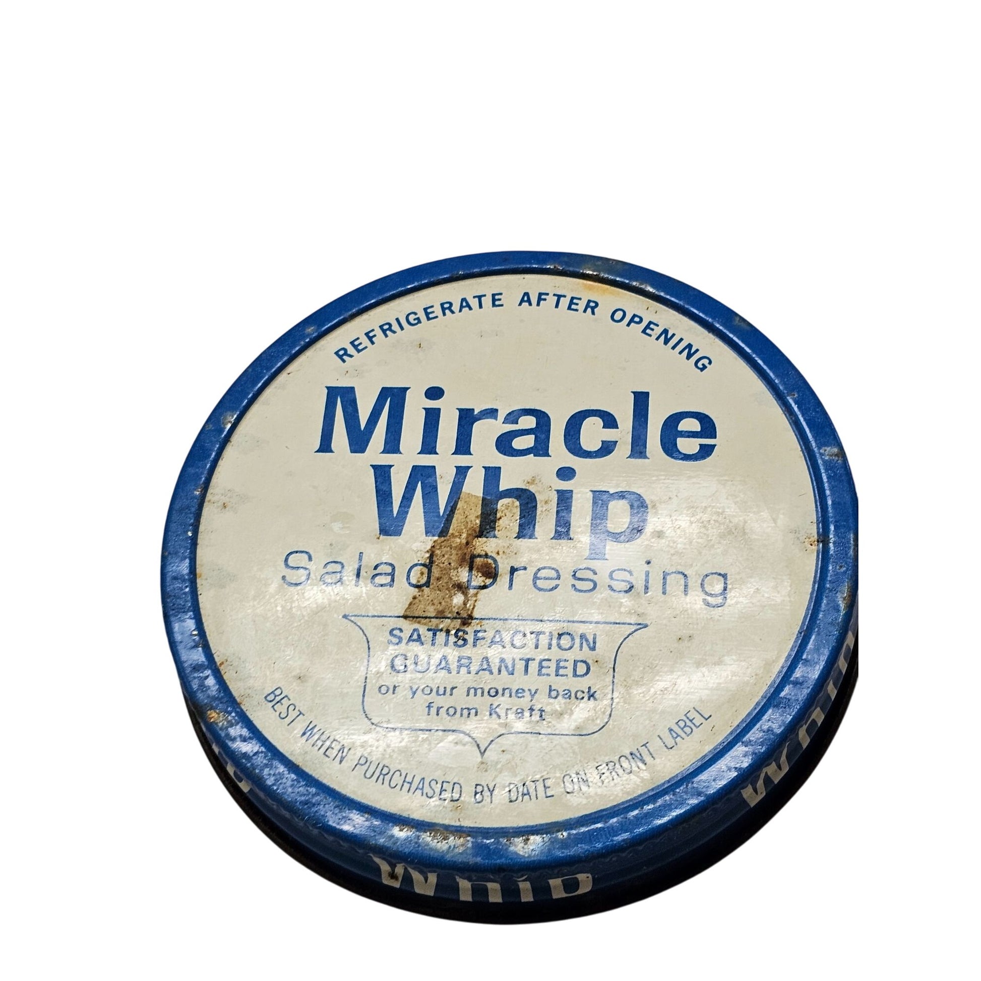 Embrace nostalgia with this vintage Miracle Whip glass jar featuring a classic blue lid. Perfectly sized for your storage needs, it adds a retro touch to your kitchen decor. The iconic branding is sure to spark conversations and memories.