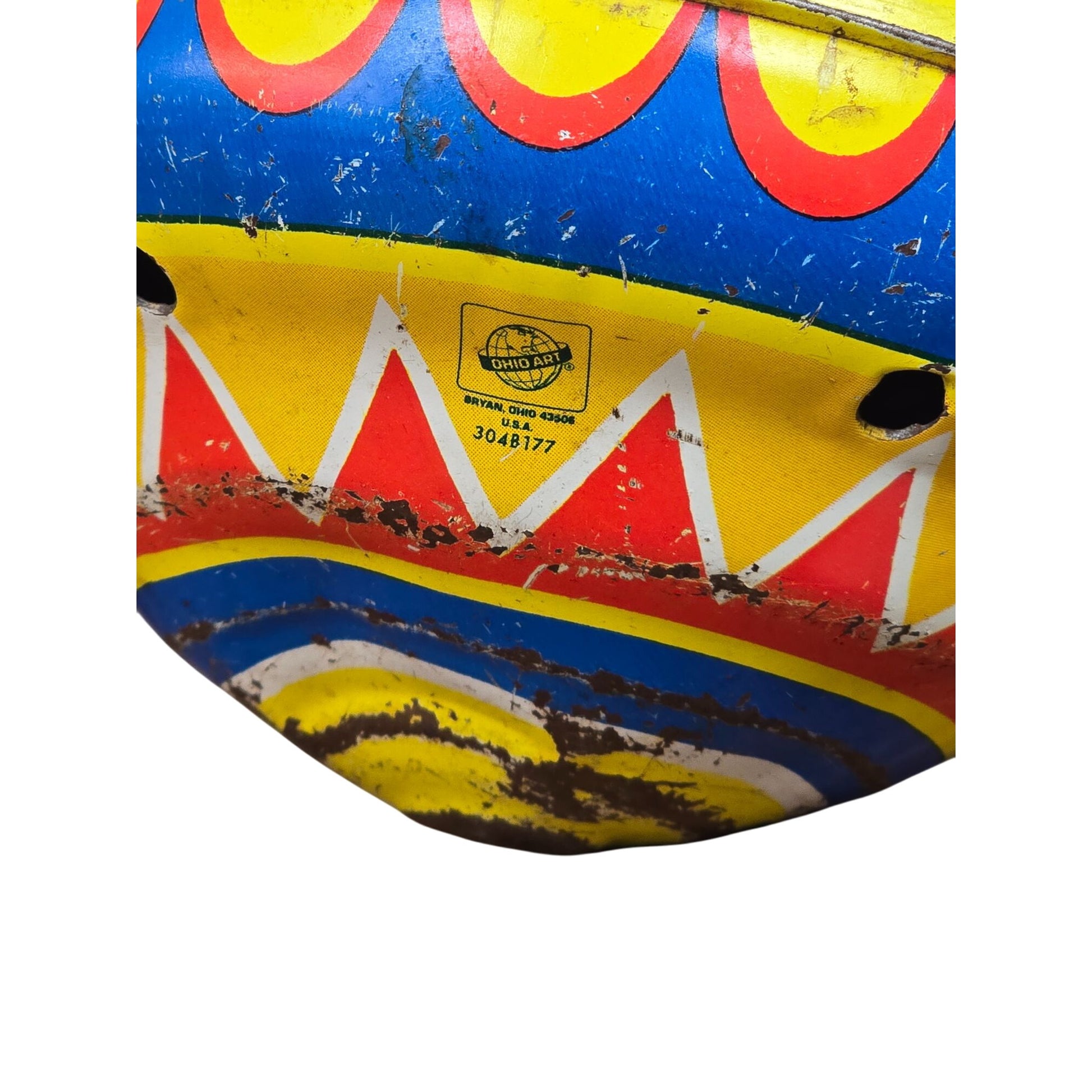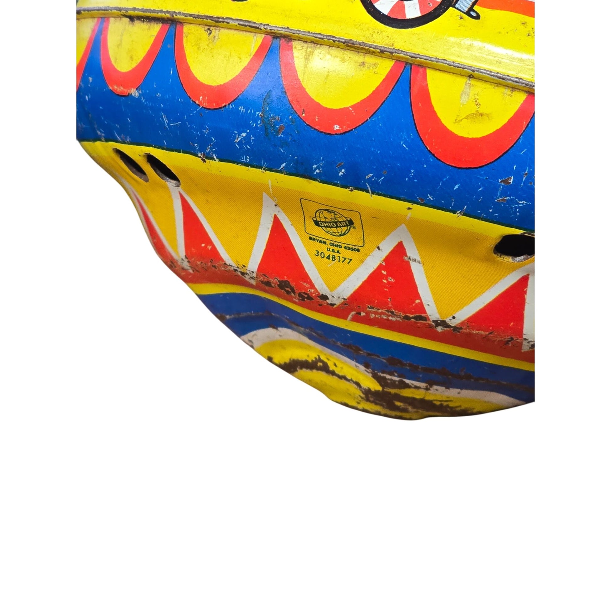 This vintage spinning top by Ohio Art Company features a charming circus train design, a nostalgic toy for collectors or as a whimsical decorative piece. Its vibrant colors and classic circus motifs capture the essence of childhood wonder, making it an ideal conversation starter or a delightful gift.