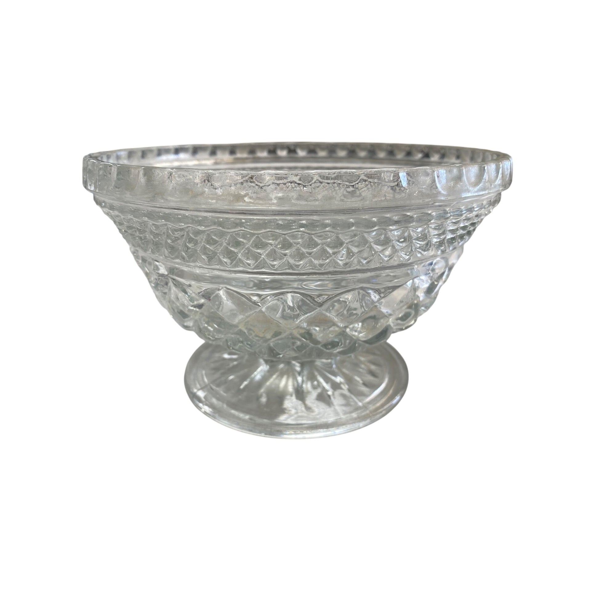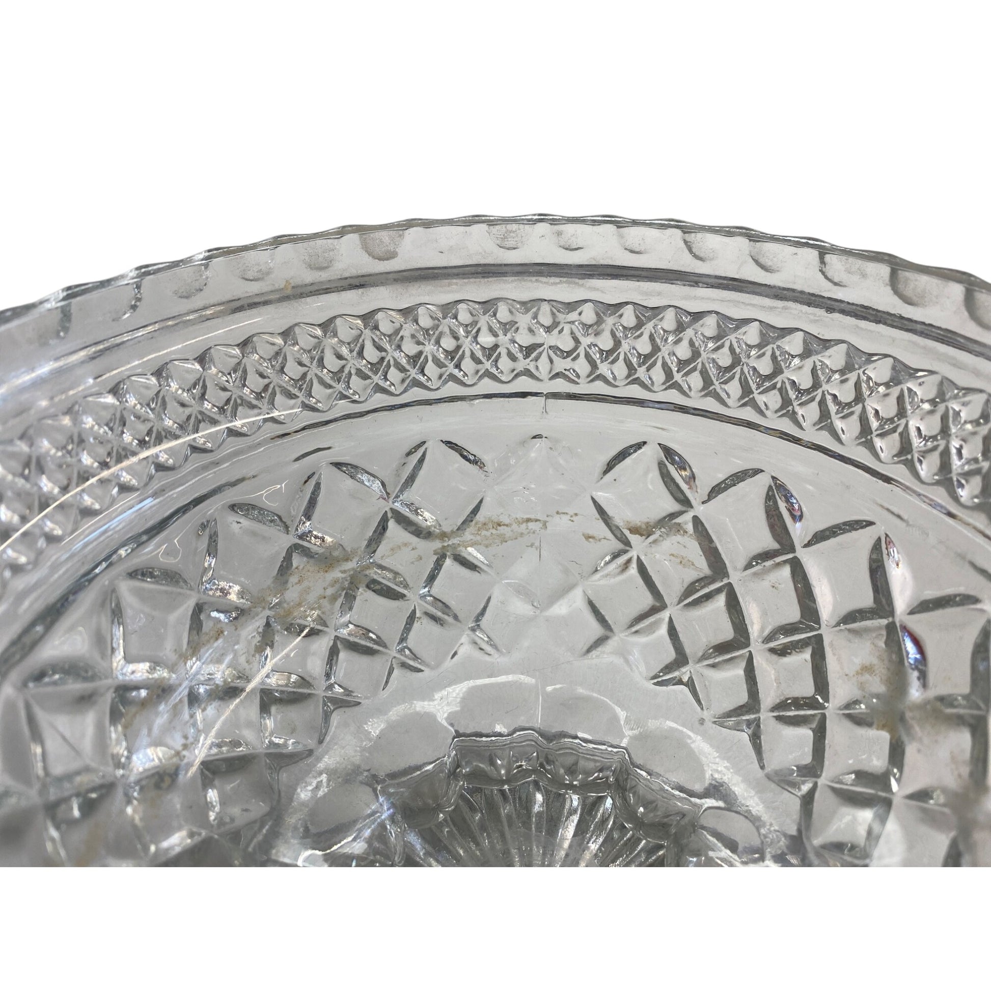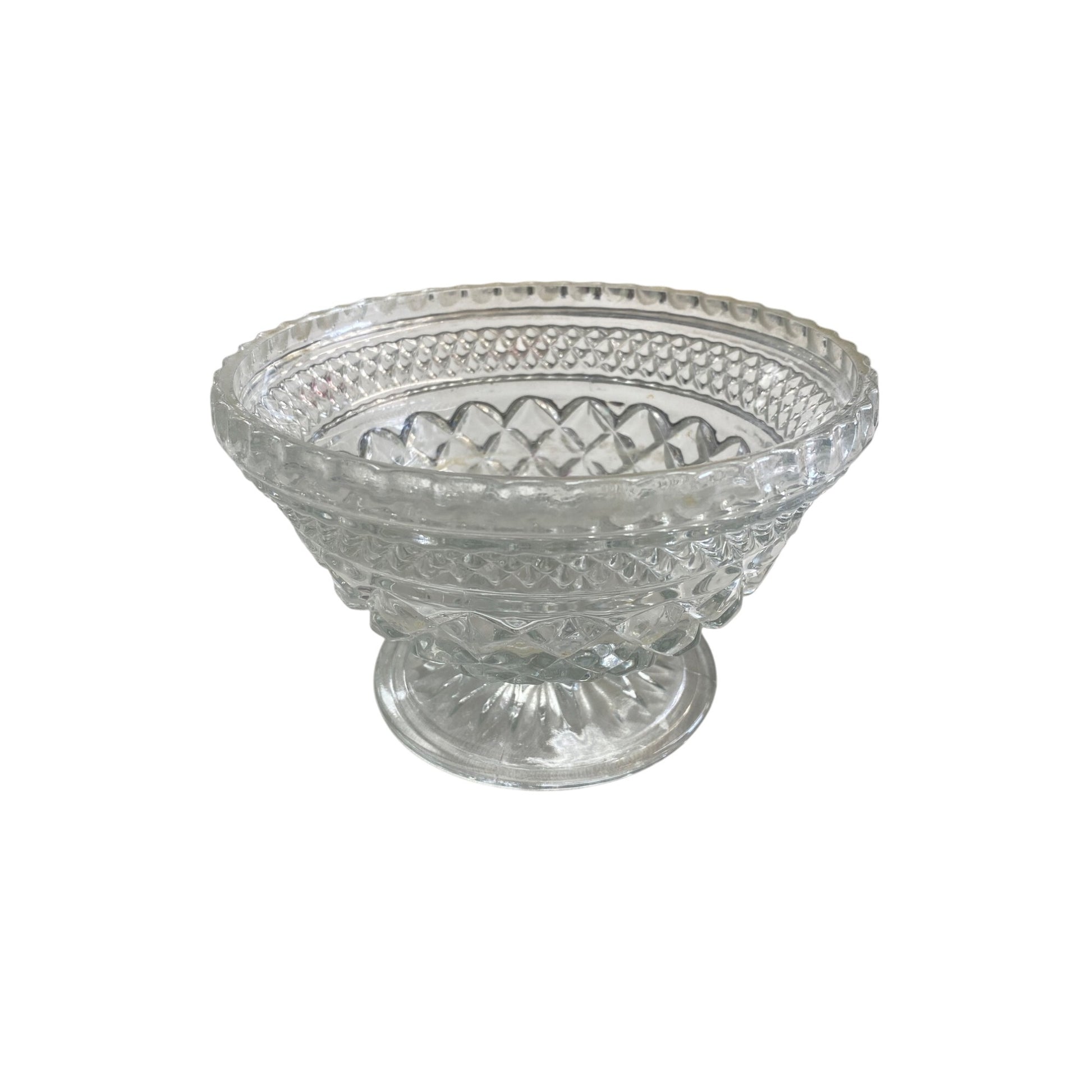 This elegant vintage glass bowl features intricate diamond and starburst patterns, adding sophistication to tabletops. Its pedestal design enhances its aesthetic appeal.