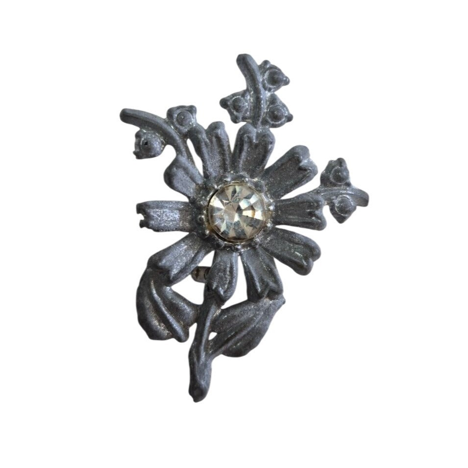 Vintage Pewter Flower Brooch Rhinestone Center Pin Jewelry Women