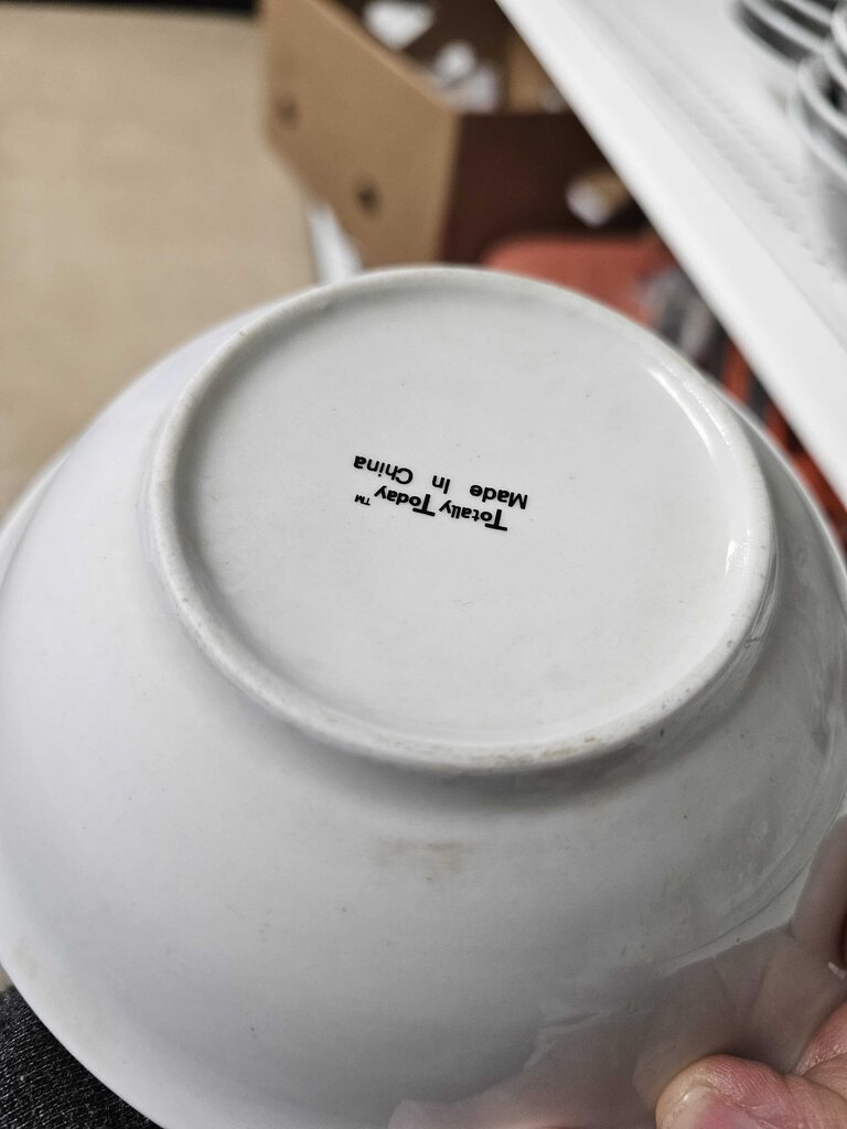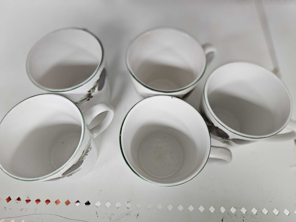 5 4" Mugs, 6- 10" dinner plates, 6- 7" dessert plates, 6 - 6.25" bowls in used condition. Some utensil scratches, some stains. The dark scratches are on one page. See photos for condition..